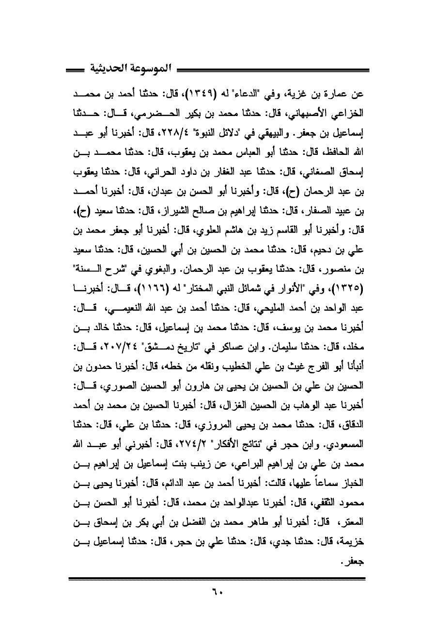 عن عمارة بن غزبة، وفي "الدعاء" له (١٣٤٩)، قال: حَدَّثَنَا أحمد بن محمد الخزاعي الأصبهاني، قال: حَدَّثَنَا محمد بن بكير الحضرمي، قال: حَدَّثَنَا إسماعيل بن جعفر. والبيهقي في "دلائل النبوة" ٤/ ٢٢٨، قال: أخبرنا أبو عبد الله الحافظ، قال: حَدَّثَنَا أبو العباس محمد بن يعقوب، قال: حَدَّثَنَا محمد بن إسحاق الصغاني، قال: حَدَّثَنَا عبد الغفار بن داود الحراني، قال: حَدَّثَنَا يعقوب بن عبد الرحمان (ح)، قال: وأخبرنا أبو الحسن بن عبدان، قال: أخبرنا أحمد بن عبيد الصفار، قال: حَدَّثَنَا إبراهيم بن صالح الشيراز، قال: حَدَّثَنَا سعيد (ح)، قال: وأخبرنا أبو القاسم زيد بن هاشم العلوي، قال: أخبرنا أبو جعفر محمد بن علي بن دحيم، قال: حَدَّثَنَا محمد بن الحسين بن أبي الحسين، قال: حَدَّثَنَا سعيد بن منصور، قال: حَدَّثَنَا يعقوب بن عبد الرحمان. والبغوي في "شرح السنة" (١٣٢٥)، وفي "الأنوار في شمائل النَّبِيّ المختار" له (١١٦٦)، قال: أخبرنا عبد الواحد بن أحمد المليحي، قال: حَدَّثَنَا أحمد بن عبد الله النعيمي، قال: أخبرنا محمد بن يوسف، قال: حَدَّثَنَا محمد بن إسماعيل، قال: حَدَّثَنَا خالد بن مخلد، قال: حَدَّثَنَا سليمان. وابن عساكر في "تاريخ دمشق" ٢٤/ ٢٠٧، قال: أنبأنا أبو الفرج غيث بن علي الخطيب ونقله من خطه، قال: أخبرنا حمدون بن الحسين بن علي بن الحسين بن يحيى بن هارون أبو الحسين الصوري، قال: أخبرنا عبد الوهاب بن الحسين الغزال، قال: أخبرنا الحسين بن محمد بن أحمد الدقاق، قال: حَدَّثَنَا محمد بن يحيى المروزي، قال: حَدَّثَنَا بن علي، قال: حَدَّثَنَا المسعودي. وابن حجر في "نتائج الأفكار" ٢/ ٢٧٤، قال: أخبرني أبو عبد الله محمد بن علي بن إبراهيم البراعي، عن زينب بنت إسماعيل بن إبراهيم بن الخباز سماعًا عليها، قالت: أخبرنا أحمد بن عبد الدائم، قال: أخبرنا يحيى بن محمود الثقفي، قال: أخبرنا عبد الواحد بن محمد، قال: أخبرنا أبو الحسن بن المعتر، قال: أخبرنا أبو طاهر محمد بن الفضل بن أبي بكر بن إسحاق بن خزيمة، قال: حَدَّثَنَا جدي، قال: حَدَّثَنَا علي بن حجر، قال: حَدَّثَنَا إسماعيل بن جعفر.