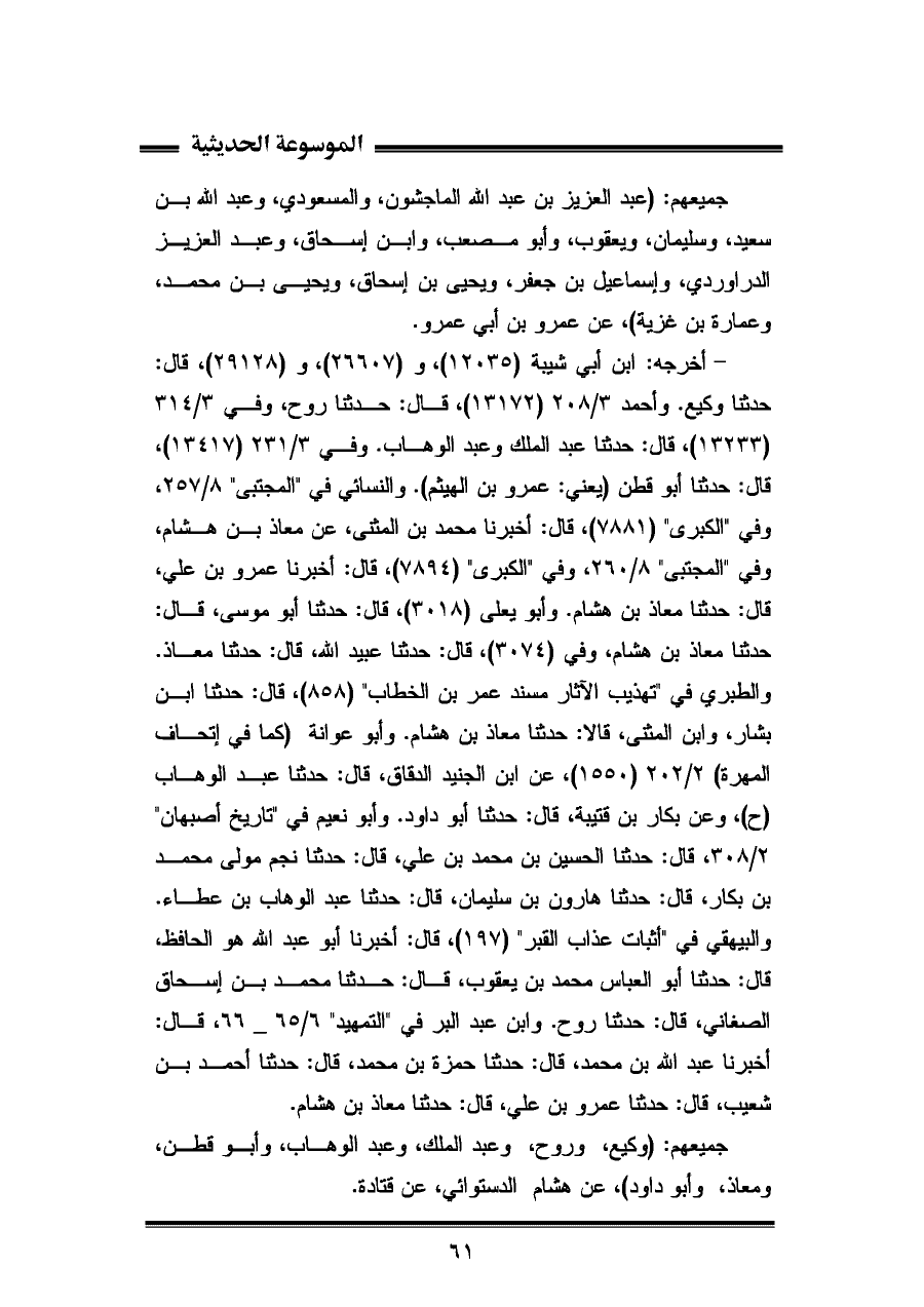 جميعهم: (عبد العزيز بن عبد الله الماجشون، والمسعودي، وعبد الله بن سعيد، وسليمان، ويعقوب، وأبو مصعب، وابن إسحاق، وعبد العزيز الدراوردي، وإسماعيل بن جعفر، ويحيى بن إسحاق، ويحيى بن محمد، وعمارة بن غزية)، عن عمرو بن أبي عمرو.