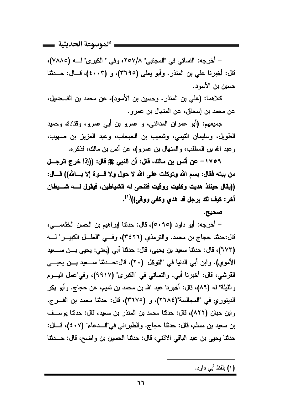 ١٧٥٩ - عن أنس بن ملك، قال: أن النَّبِيّ - صلى الله عليه وسلم - قال: "إذا خرج الرجل من بيته فقال: بسم اللّه وتوكلت على الله لا حول ولا قوة إِلَّا باللّه" قال: "يقال حينئذ هديت وكفيت ووقيت فتنحى له الشياطين، فيقول له شيطان آخر: كيف لك برجل قد هدي وكفى ووقى" (¬١).