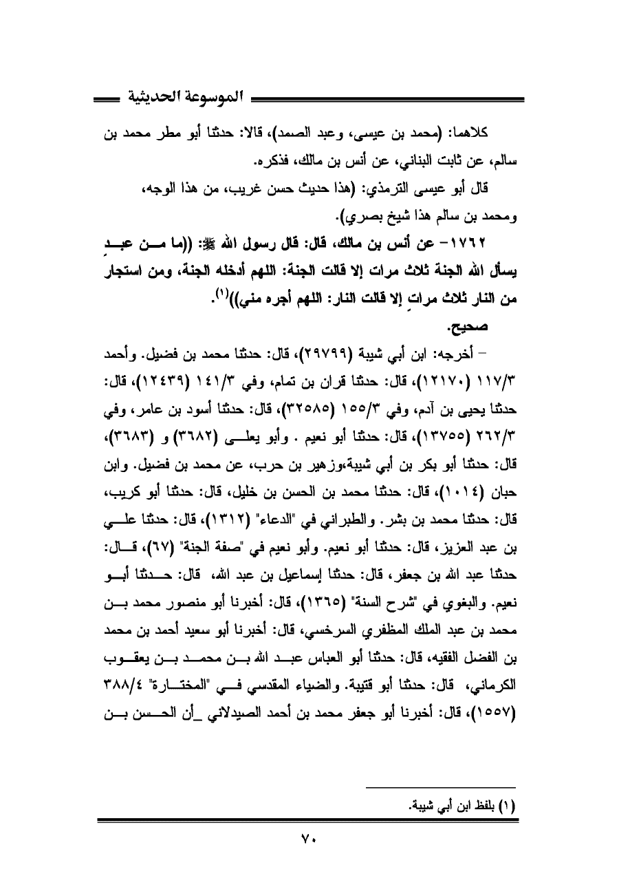 ١٧٦٢ - عن أنس بن مالك، قال: قال رسول اللّه - صلى الله عليه وسلم -: "ما من عبدٍ يسأل الله الجنة ثلاث مرات إِلَّا قالت الجنة: اللهم أدخله الجنة، ومن استجار من النار ثلاث مراتٍ إِلَّا قالت النار: اللهم أجره مني" (¬١).