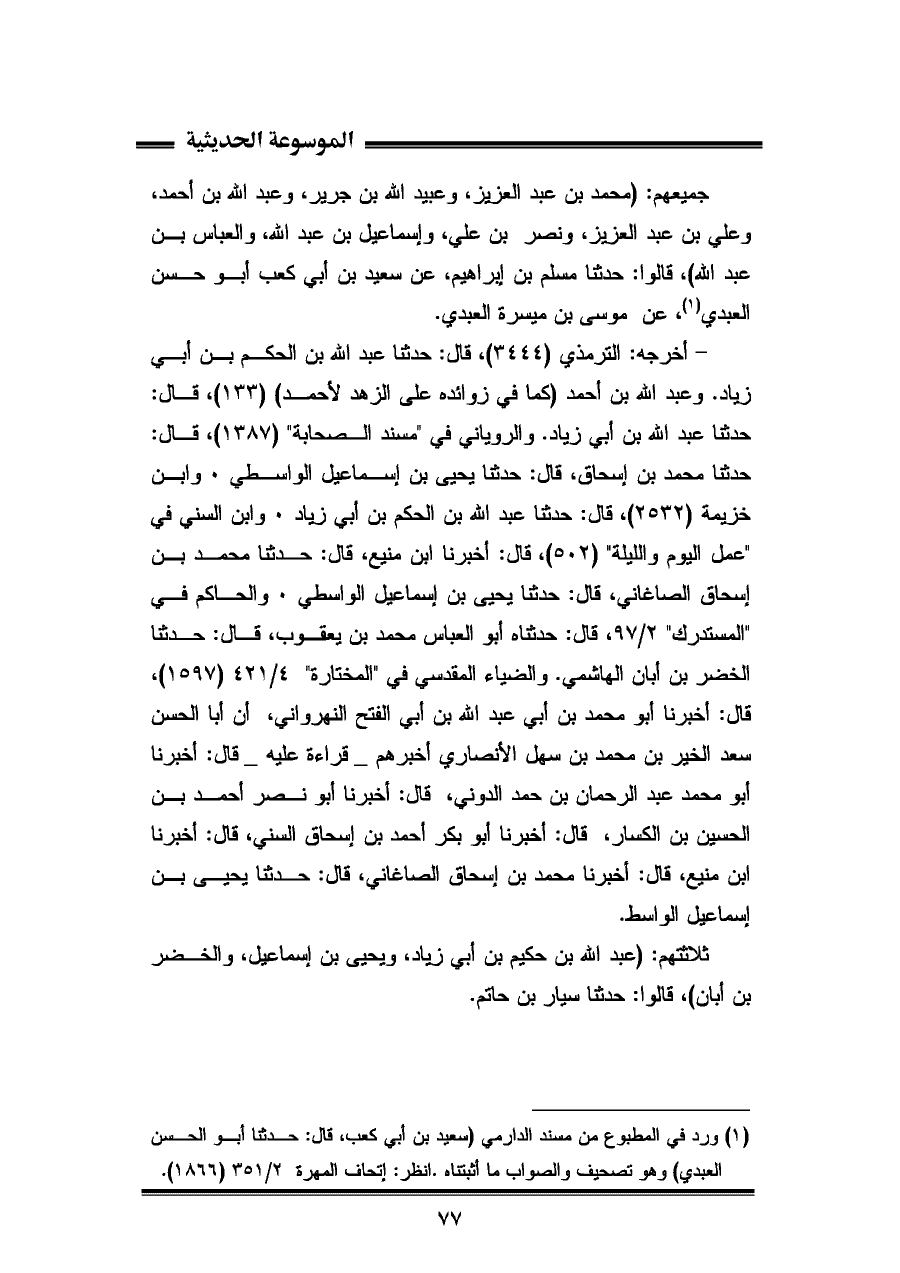 جميعهم: (محمد بن عبد العزيز، وعبيد الله بن جربر، وعبد الله بن أحمد، وعلي بن عبد العزيز، ونصر بن علي، وإسماعيل بن عبد الله، والعباس بن عبد الله)، قلوا: حَدَّثَنَا مسلم بن إبراهيم، عن سعيد بن أبي كعب أبو حسن العبدي (¬١)، عن موسى بن ميسرة العبدي.