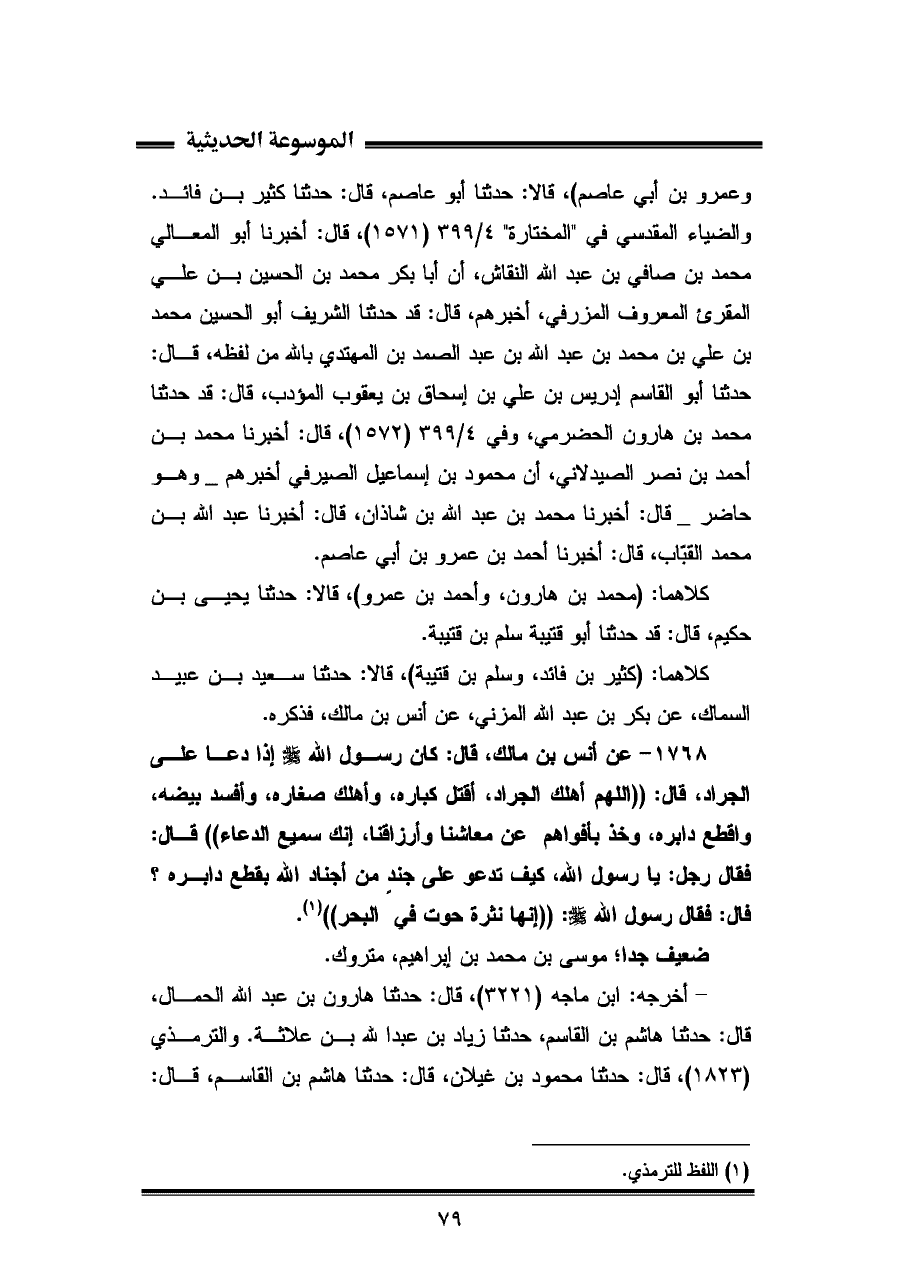 ١٧٦٨ - عن أنس بن مالك، قال: كان رسول اللّه - صلى الله عليه وسلم - إذا دعا على الجراد، قال: "اللهم أهلك لجراد، أقتل كباره، وأهلك صغاره، وأفسد بيضه، واقطع دابره، وخذ بأفواهم عن معاشنا وأرزاقنا، إنك سميع الدعاء" قال: فقال رجل: يا رسول اللّه، كيف تدعو على جندٍ من أجناد الله بقطع دابره؟ قال: فقال رسول اللّه - صلى الله عليه وسلم -: "إنها نثرة حوت في البحر" (¬١).