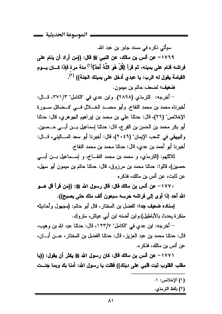 ١٧٧٠ - عن أنس بن مالك قال: قال رسول اللّه - صلى الله عليه وسلم -: "من قرأَ قل هو الله أَحد إذا أَوى إلى فراشه حرسه سبعون ألف ملك حتى يصبح".