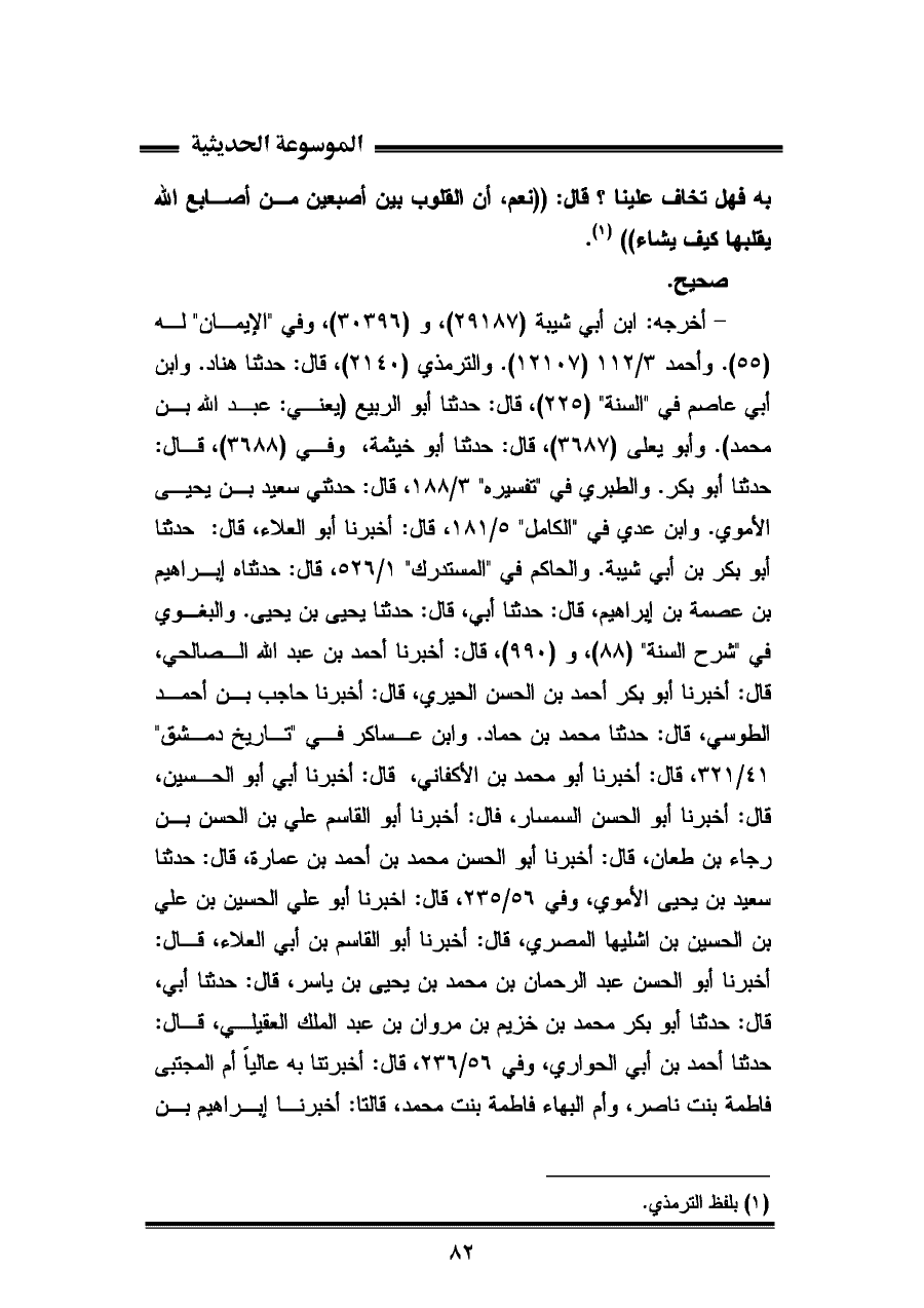 به فهل تخاف علينا؟ قال: "نعم، أن القلوب بين أصبعين من أصابع اللّه يقلبها كيف يشاء" (¬١).