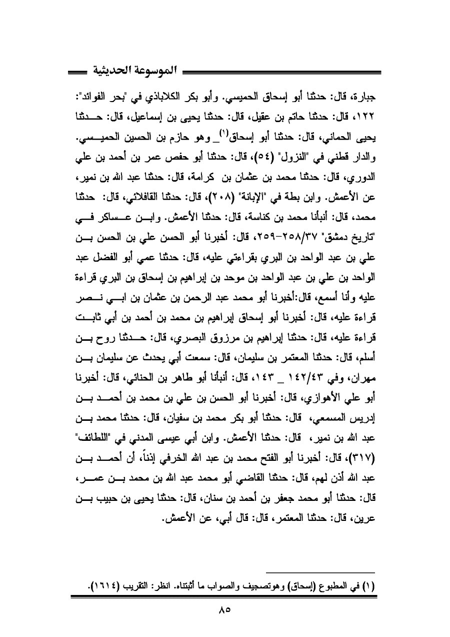 جبارة، قال: حَدَّثَنَا أبو إسحاق الحميسي. وأبو بكر الكلاباذي في "بحر الفوائد": ١٢٢، قال: حَدَّثَنَا حاتم بن عقيل، قال: حَدَّثَنَا يحيى بن إسماعيل، قال: حَدَّثَنَا يحيى الحماني، قال: حَدَّثَنَا أبو إسحاق (¬١) وهو حازم بن الحسين الحميسي. والدارقطني في "النزول" (٥٤)، قال: حَدَّثَنَا أبو حفص عمر بن أحمد بن علي الدوري، قال: حَدَّثَنَا محمد بن عثمان بن كرامة، قال: حَدَّثَنَا عبد الله بن نمير، عن الأعمش. وابن بطة في "الإبانة" (٢٠٨)، قال: حَدَّثَنَا القافلائي، قال: حَدَّثَنَا محمد، قال: أنبأنا محمد بن كناسة، قال: حَدَّثَنَا الأعمش. وابن عساكر في "تاريخ دمشق" ٣٧/ ٢٥٨ - ٢٥٩، قال: أخبرنا أبو الحسن علي بن الحسن بن علي بن عبد الواحد بن البري بقراءتي عليه، قال: حَدَّثَنَا عمي أبو الفضل عبد الواحد بن علي بن عبد الواحد بن موحد بن إبراهيم بن إسحاق بن البرى قراءة عليه وأنا أسمع، قال: أخبرنا أبو محمد عبد الرحمن بن عثمان بن أبي نصر قراءة عليه، قال: أخبرنا أبو إسحاق إبراهيم بن محمد بن أحمد بن أبي ثابت قراءة عليه، قال: حَدَّثَنَا إبراهيم بن مرزوق البصري، قال: حَدَّثَنَا روح بن أسلم، قال: حَدَّثَنَا المعتمر بن سليمان، قال: سمعت أبي يحدث عن سليمان بن مهران، وفي ٤٣/ ١٤٢ - ١٤٣، قال: أنبأنا أبو طاهر بن الحنائي، قال: أخبرنا أبو علي الأهوازي، قال: أخبرنا أبو الحسن بن علي بن محمد بن أحمد بن إدريس المسمعي، قال: حَدَّثَنَا أبو بكر محمد بن سفيان، قال: حَدَّثَنَا محمد بن عبد الله بن نصير، قال: حَدَّثَنَا الأعمش. وابن أبي عيسى المدني في "اللطائف" (٣١٧)، قال: أخبرنا أبو الفتح محمد بن عبد الله الخرفي إذنًا، أن أحمد بن عبد الله أذن لهم، قال: حَدَّثَنَا القاضي أبو محمد عبد الله بن محمد بن عمر، قال: حَدَّثَنَا أبو محمد جعفر بن أحمد بن سنان، قال: حَدَّثَنَا يحيى بن حبيب بن عرين، قال: حَدَّثَنَا المعتمر، قال: قال أبي، عن الأعمش.