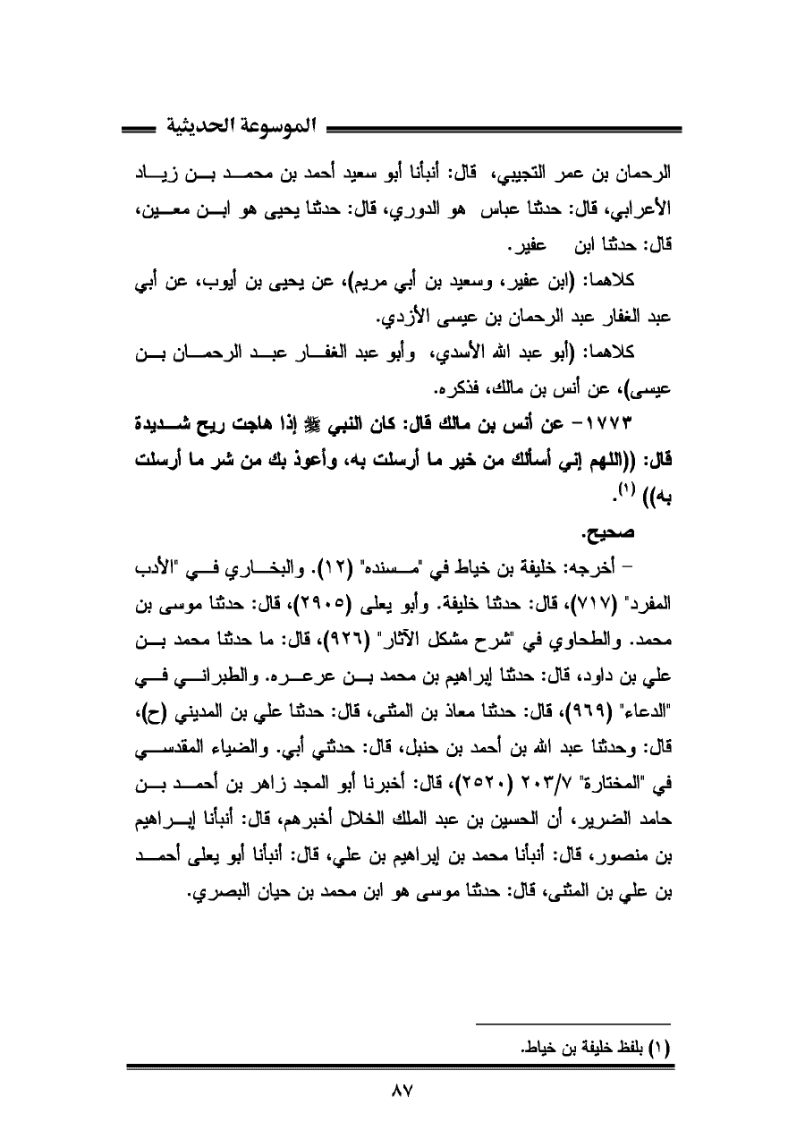 ١٧٧٣ - عن أنس بن مالك قال: كان النَّبِيّ - صلى الله عليه وسلم - إذا هاجت ريح شديدة قال: "اللهم إني أسألك من خير ما أرسلت به، وأعوذ بك من شر ما أرسلت به" (¬١).