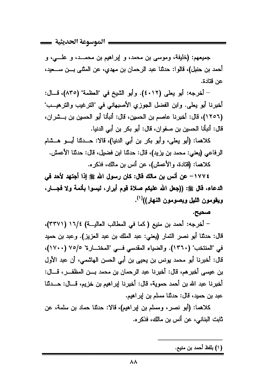 ١٧٧٤ - عن أنس بن مالك: كان رسول اللّه - صلى الله عليه وسلم - إذا اجتهد لأحد في الدعاء، قال - صلى الله عليه وسلم -: "جعل اللّه عليكم صلاة قوم أبرار، ليسوا بأئمة ولا فجار، ويقومون الليل ويصومون النهار" (¬١).