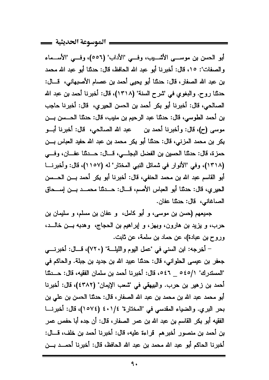 أبو الحسن بن موسى الأشيب، وفي "الأداب" (٥٥٦)، وفي "الأسماء والصفات": ١٥، قال: أخبرنا أبو عبد الله الحافظ، قال: حَدَّثَنَا أبو عبد الله محمد بن عبد الله الصفار، قال: حدثنا أبو يحيى أحمد بن عصام الأصبهاني، قال: حَدَّثَنَا روح. والبغوي في "شرح السنة" (١٣١٨)، قال: أخبرنا أحمد بن عبد الله الصالحي، قال: أخبرنا أبو بكر أحمد بن الحسن الحيري، قال: أخبرنا حاجب بن أحمد الطوسي، قال: حَدَّثَنَا عبد الرحيم بن منيب، قال: حَدَّثَنَا الحسن بن موسى (ح)، قال: وأخبرنا أحمد بن عبد الله الصالحي، قال: أخبرنا أبو بكر بن محمد المزني، قال: حَدَّثَنَا أبو بكر محمد بن عبد الله حفيد العباس بن حمزة، قال: حَدَّثَنَا الحسين بن الفضل البجلي، قال: حَدَّثَنَا عفان، وفي (١٣١٨)، وفي "الأنوار في شمائل النَّبِيّ المختار" له (١١٥٧)، قال: وأخبرنا أبو القاسم عبد الله بن محمد الحنفي، قال: أخبرنا أبو بكر أحمد بن الحسن الحيري، قال: حَدَّثَنَا أبو العباس الأصم، قال: حَدَّثَنَا محمد بن إسحاق الصاغاني، قال: حَدَّثَنَا عفان.