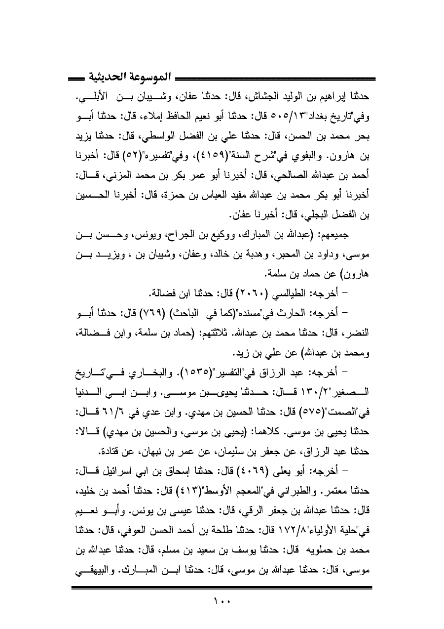 جميعهم: (عبد الله بن المبارك، ووكيع بن الجراح، ويونس، وحسن بن موسى، وداود بن المحبر، وهدبة بن خالد، وعفان، وشيبان بن، ويزيد بن هارون) عن حماد بن سلمة.