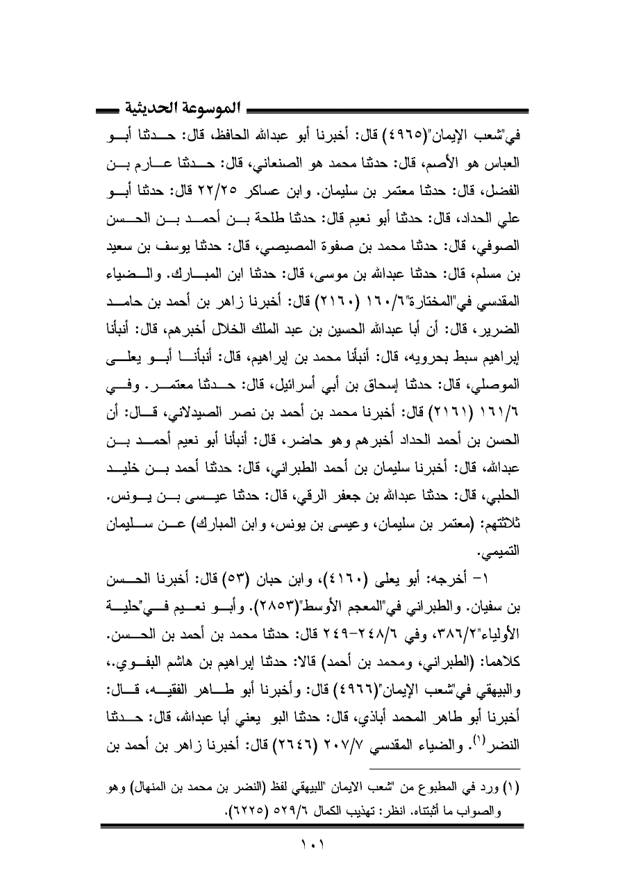 في "شعب الإيمان" (٤٩٦٥) قال: أخبرنا أبو عبد الله الحافظ، قال: حدثنا أبو العباس هو الأصم، قال: حدثنا محمد هو الصنعاني، قال: حدثنا عارم بن الفضل، قال: حدثنا معتمر بن سليمان. وابن عساكر ٢٥/ ٢٢ قال: حدثنا أبو علي الحداد، قال: حدثنا أبو نعيم قال: حدثنا طلحة بن أحمد بن الحسن الصوفي، قال: حدثنا محمد بن صفوة المصيصي، قال: حدثنا يوسف بن سعيد بن مسلم، قال: حدثنا عبد الله بن موسى، قال: حدثنا ابن المبارك. والضياء المقدسي في "المختارة" ٦/ ١٦٠ (٢١٦٠) قال: أخبرنا زاهر بن أحمد بن حامد الضرير، قال: أن أبا عبد الله الحسين بن عبد الملك الخلال أخبرهم، قال: أنبأنا إبراهيم سبط بحرويه، قال: أنبأنا محمد بن إبراهيم، قال: أنبأنا أبو يعلى الموصلي، قال: حدثنا إسحاق بن أبي إسرائيل، قال: حدثنا معتمر. وفي ٦/ ١٦١ (٢١٦١) قال: أخبرنا محمد بن أحمد بن نصر الصيدلاني، قال: أن الحسن بن أحمد الحداد أخبرهم وهو حاضر، قال: أنبأنا أبو نعيم أحمد بن عبد الله، قال: أخبرنا سليمان بن أحمد الطبراني، قال: حدثنا أحمد بن خليد الحلبي، قال: حدثنا عبد الله بن جعفر الرقي، قال: حدثنا عيسى بن يونس. ثلاثتهم: (معتمر بن سليمان، وعيسى بن يونس، وابن المبارك) عن سليمان التميمي.