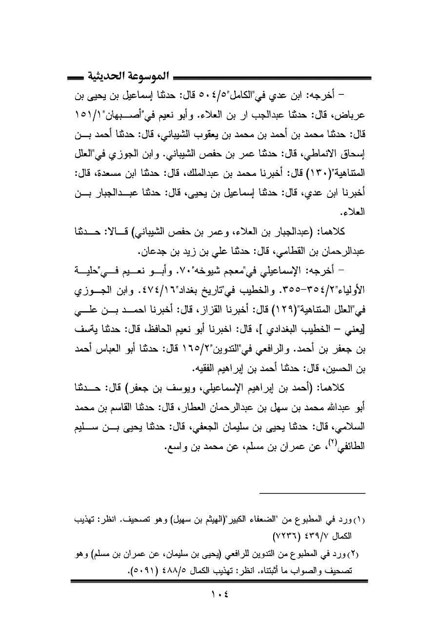 - أخرجه: ابن عدي في "الكامل" ٥/ ٥٠٤ قال: حدثنا إسماعيل بن يحيى بن عرباض، قال: حدثنا عبد الجبار بن العلاء. وأبو نعيم في "أصبهان" ١/ ١٥١ قال: حدثنا محمد بن أحمد بن محمد بن يعقوب الشيباني، قال: حدثنا أحمد بن إسحاق الأنماطي، قال: حدثنا عمر بن حفص الشيباني. وابن الجوزي في "العلل المتناهية" (١٣٠) قال: أخبرنا محمد بن عبد الملك، قال: حدثنا ابن مسعدة، قال: أخبرنا ابن عدي، قال: حدثنا إسماعيل بن يحيى، قال: حدثنا عبد الجبار بن العلاء.