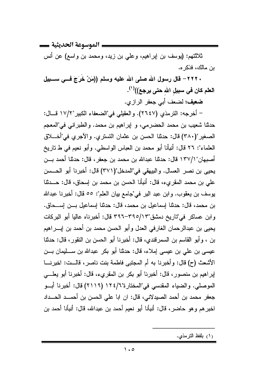 ٢٢٢٠ - قال رسول الله صلى الله عليه وسلم "مَنْ خَرَجَ في سبيل العلم كان في سبيلِ اللهِ حتى يرجعَ" (¬١).