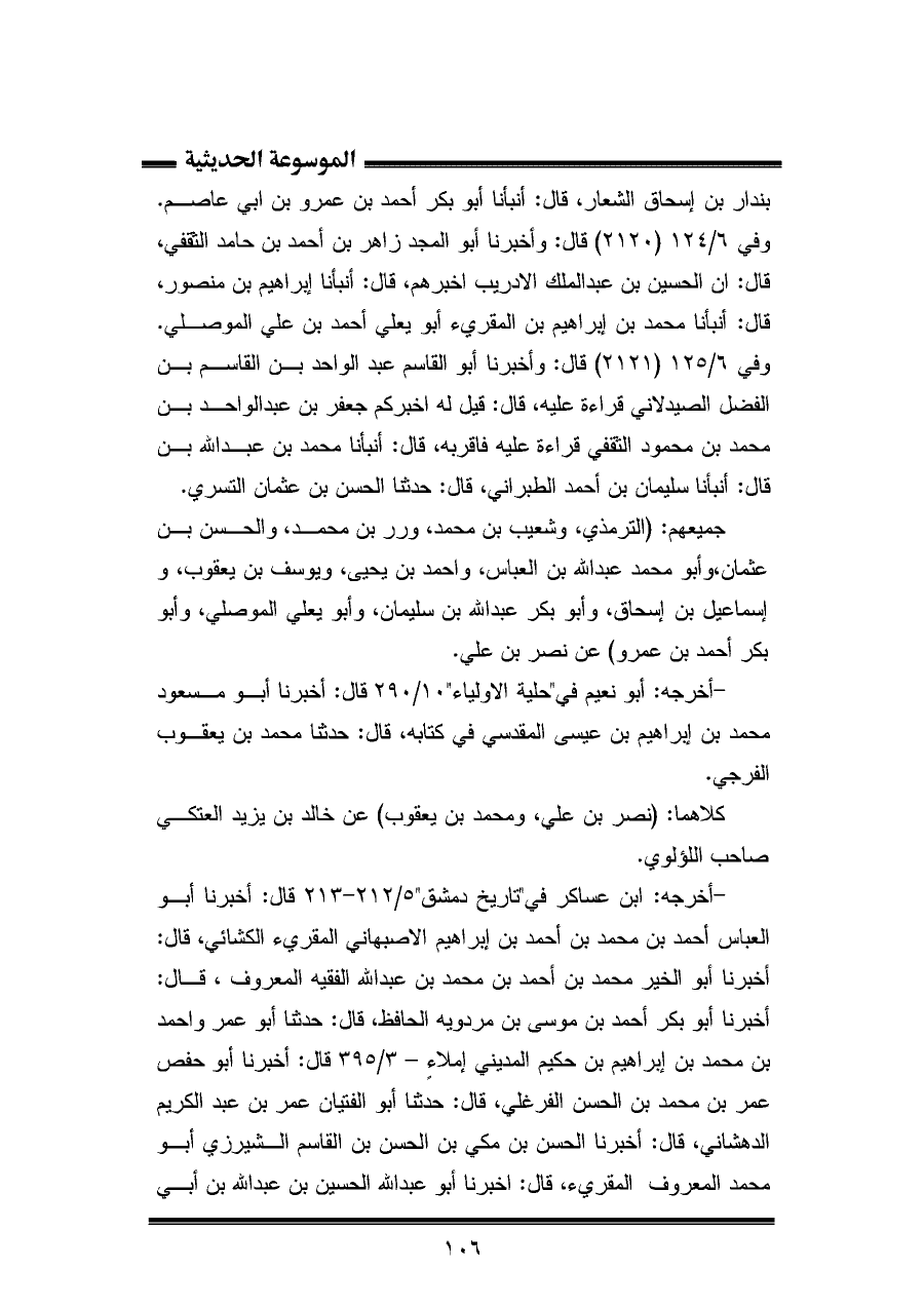 بندار بن إسحاق الشعار، قال: أنبأنا أبو بكر أحمد بن عمرو بن أبي عاصم. وفي ٦/ ١٢٤ (٢١٢٠) قال: وأخبرنا أبو المجد زاهر بن أحمد بن حامد الثقفي، قال: أن الحسين بن عبد الملك الادريب أخبرهم، قال: أنبأنا إبراهيم بن منصور، قال: أنبأنا محمد بن إبراهيم بن المقريء أبو يعلي أحمد بن علي الموصلي. وفي ٦/ ١٢٥ (٢١٢١) قال: وأخبرنا أبو القاسم عبد الواحد بن القاسم بن الفضل الصيدلاني قراءة عليه، قال: قيل له أخبركم جعفر بن عبد الواحد بن محمد بن محمود الثقفي قراءة عليه فأقر به، قال: أنبأنا محمد بن عبد الله بن قال: أنبأنا سليمان بن أحمد الطبراني، قال: حدثنا الحسن بن عثمان التسري.