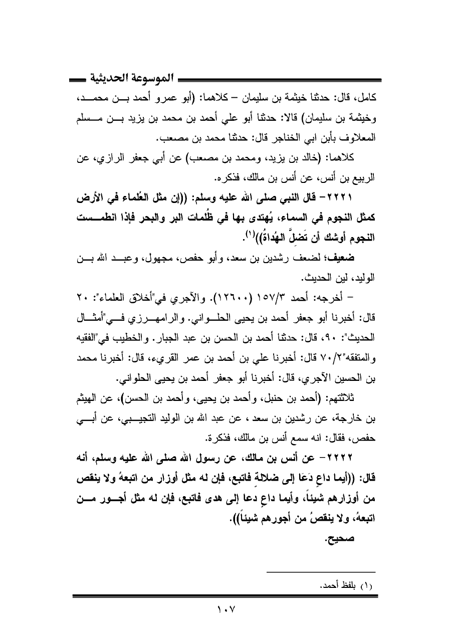 ٢٢٢٢ - عن أنس بن مالك، عن رسول الله صلى الله عليه وسلم، أنه قال: "أيما داعٍ دَعَا إلى ضلالةٍ فاتبع، فإن له مثل أوزار من اتبعهُ ولا ينقص من أوزارهم شيئًا، وأيما داعٍ دَعا إلى هدى فاتبع، فإن له مثل أجور من اتبعهُ، ولا ينقصُ من أجورهم شيئًا".