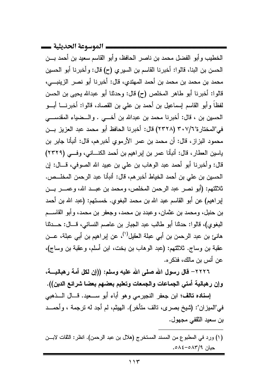 ٢٢٢٦ - قال رسول الله صلى الله عليه وسلم: "إن لكل أمة رهبانية، وإن رهبانية أمتي الجماعات والجمعات وتعليم بعضهم بعضا شرائع الدين".