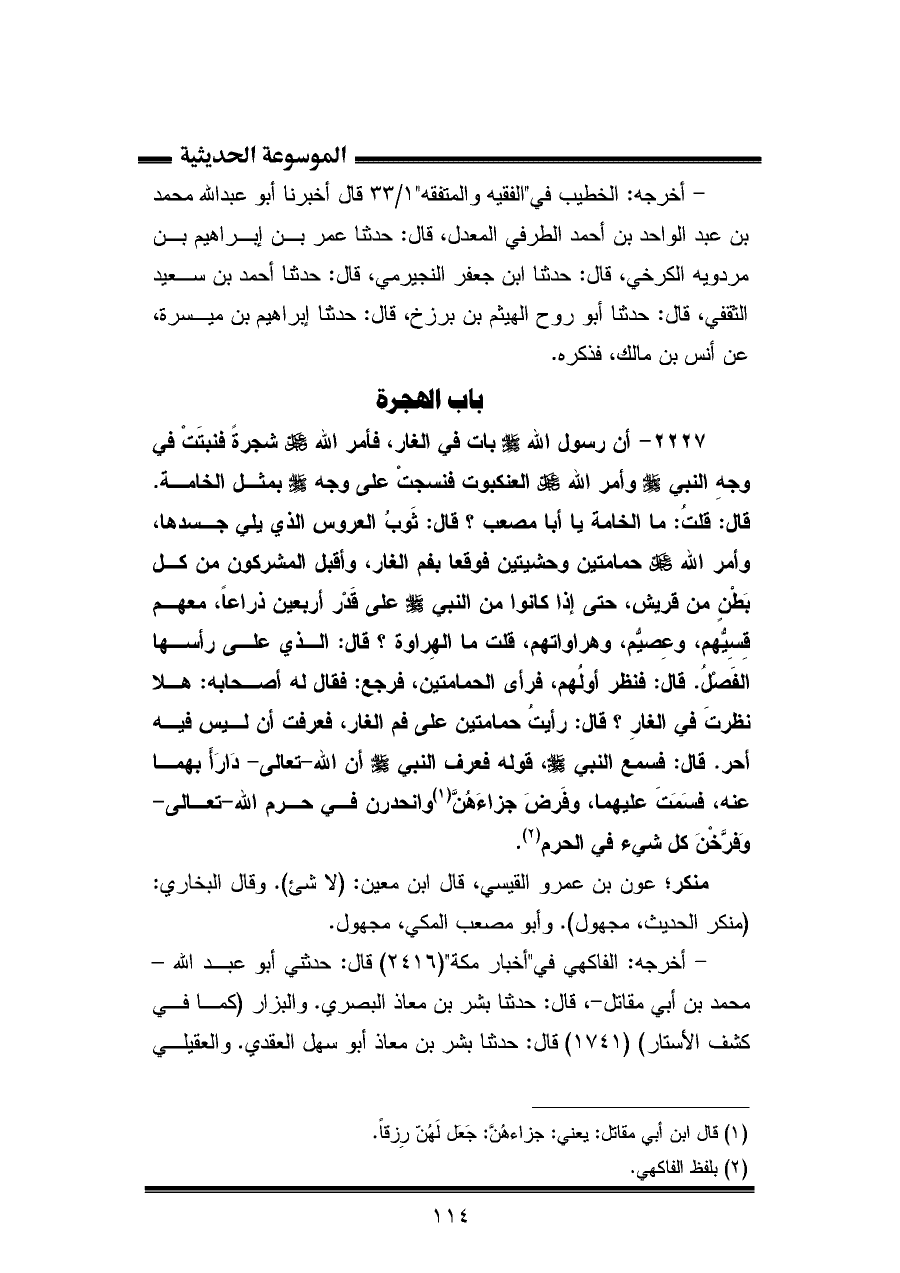 ٢٢٢٧ - أن رسول الله - صلى الله عليه وسلم - بات في الغار، فأمر الله -عز وجل - شجرةً فنبتَتْ في وجهِ النبي - صلى الله عليه وسلم - أمر اللّه -عَزَّ وَجَلَّ- العنكبوت فنسجتْ على وجه - صلى الله عليه وسلم - بمثل الخامة. قال: قلتُ ما الخامة يا أبا مصعب؟ قال: ثَوبُ العروس الذي يلي جسدها، وأمر الله -عَزَّ وَجَلَّ- حمامتين وحشيتين فوقعا بفم الغار، وأقبل المشركون من كل بَطْنٍ من قريش، حتى إذا كانوا من النبي - صلى الله عليه وسلم - على قَدْر أربعين ذراعًا، معهم قِسِيُّهم، وعِصيُّهم، وهراواتهم، قلت ما الهِراوة؟ قال: الذي على رأسها الفَصْلُ. قال: فنظر أولُهم، فرأى الحمامتين، فرجع: فقال له أصحابه: هلا نظرتَ في الغارِ؟ قال: رأيتُ حمامتين على فم الغار، فعرفت أن ليس فيه أحد. قال: فسمع النبي - صلى الله عليه وسلم -، قوله فعرف النبي - صلى الله عليه وسلم - أن اللّه - تعالى - دَارَأ بهما عنه، فسَمَتَ عليهما، وفَرضَ جزاءَهُنَّ (¬١) وانحدرن في حرم الله - تعالى - وَفرَّخْنَ كل شيء في الحرم (¬٢).