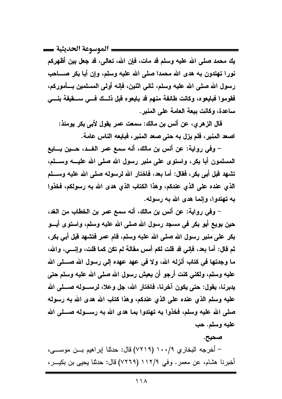 - وفي رواية: عن أنس بن مالك، أنه سمع عمر بن الخطاب من الغد، حين بويع أبو بكر في مسجد رسول الله صلى الله عليه وسلم، واستوى أبو بكر على منبر رسول الله صلى الله عليه وسلم، قام عمر فتشهد قبل أبي بكر، ثم قال: أما بعد، فإني قد قلت لكم أمس مقالة لم تكن كما قلت، وإني، والله، ما وجدتها في كتاب أنزله الله، ولا في عهد عهده إلي رسول الله صلى الله عليه وسلم، ولكني كنت أرجو أن يعيش رسول الله صلى الله عليه وسلم حتى يدبرنا، يقول: حتى يكون آخرنا، فاختار الله، جل وعلا، لرسوله صلى الله عليه وسلم الذي عنده على الذي عندكم، وهذا كتاب الله هدى الله به رسوله صلى الله عليه وسلم، فخذوا به تهتدوا بما هدى الله به رسوله صلى الله عليه وسلم.