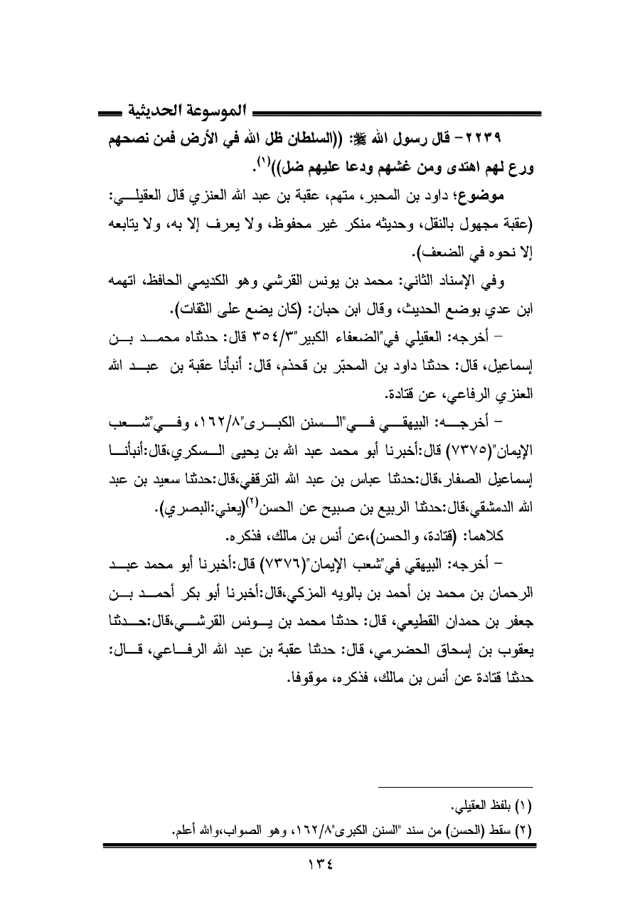 ٢٢٣٩ - قال رسول الله - صلى الله عليه وسلم -: "السلطان ظل الله في الأرض فمن نصحهم ورع لهم اهتدى ومن غشهم ودعا عليهم ضل" (¬١).