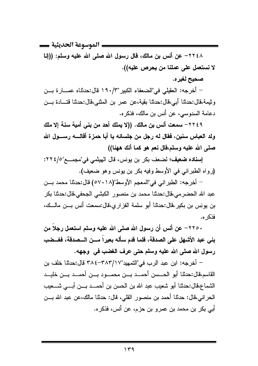 ٢٢٤٩ - سمعت أنس بن مالك: "لا يملك أحد من بني أمية سنة إلا ملك ولد العباس سنين، فقال له رجل من جلسائه يا أبا حمزة أقاله رسول الله صلى الله عليه وسلم، قال نعم هو كما أنك ههنا".
