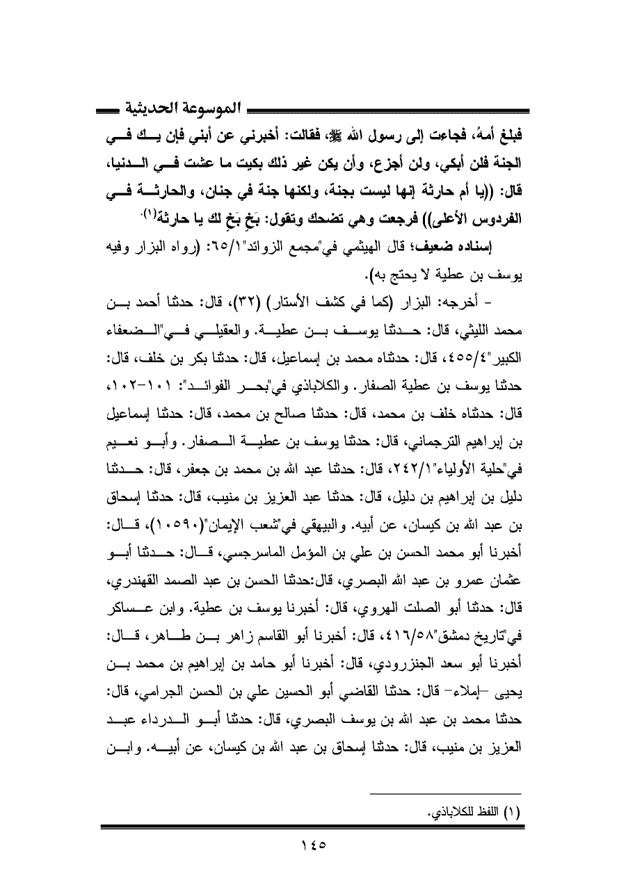 فبلغ أمهُ، فجاءت إلى رسول الله - صلى الله عليه وسلم -، فقالت: أخبرني عن أبني فإن يك في الجنة فلن أبكي، ولن أجزع، وأن يكن غير ذلك بكيت ما عشت في الدنيا، قال: "يا أم حارثة إنها ليست بجنة، ولكنها جنة في جنان، والحارثة في الفردوس الأعلى" فرجعت وهي تضحك وتقول: بَخٍ بَخٍ لك يا حارثة (¬١).