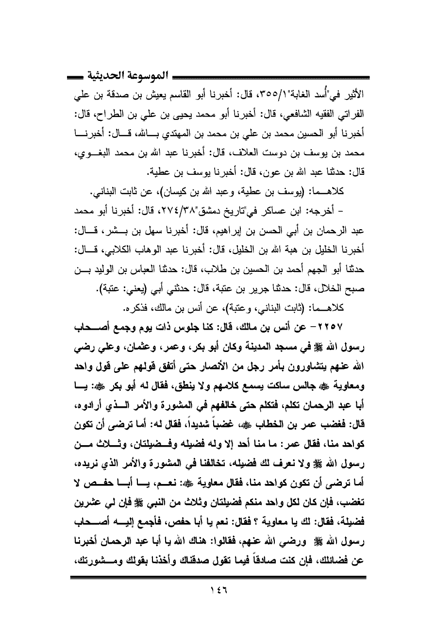 ٢٢٥٧ - عن أنس بن مالك، قال: كنا جلوس ذات يوم وجمع أصحاب رسول الله - صلى الله عليه وسلم - في مسجد المدينة وكان أبو بكر، وعمر، وعثمان، وعلي رضي الله عنهم يتشاورون بأمر رجل من الأنصار حتى اتفق قولهم على قول واحد ومعاوية - رضي الله عنه - جالس ساكت يسمع كدمهم ولا ينطق، فقال له أبو بكر - رضي الله عنه -: يا أبا عبد الرحمان تكلم، فتكلم حتى خالفهم في المشورة والأمر الذي أرادوه، قال: فغضب عمر بن الخطاب - رضي الله عنه -، غضبًا شديدًا، فقال له: أما ترضى أن تكون كواحد منا، فقال عمر: ما منا أحد إلا وله فضيله وفضيلتان، وثلاث من رسول الله - صلى الله عليه وسلم - ولا نعرف لك فضيله، تخالفنا في المشورة والأمر الذي نريده، أما ترضى أن تكون كواحد منا، فقال معاوية - رضي الله عنه -: نعم، يا أبا حفص لا تغضب، فإن كان لكل واحد منكم فضيلتان وثلاث من النبي - صلى الله عليه وسلم - فإن لي عشرين فضيلة، فقال: لك يا معاوية؟ فقال: نعم يا أبا حفص، فأجمع إليه أصحاب رسول الله - صلى الله عليه وسلم - ورضي اللّه عنهم، فقالوا: هناك الله يا أبا عبد الرحمان أخبرنا عن فضائلك، فإن كنت صادقًا فيما تقول صدقناك وأخذنا بقولك ومشورتك،