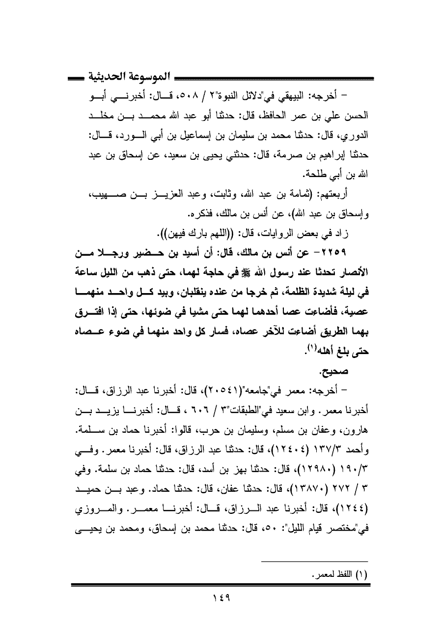 ٢٢٥٩ - عن أنس بن مالك، قال: أن أسيد بن حضير ورجلا من الأنصار تحدثا عند رسول الله - صلى الله عليه وسلم - في حاجة لهما، حتى ذهب من الليل ساعة في ليلة شديدة الظلمة، ثم خرجا من عنده ينقلبان، وبيد كل واحد منهما عصية، فأضاءت عصا أحدهما لهما حتى مشيا في ضوئها، حتى إذا افترق بهما الطريق أضاءت للآخر عصاه، فسار كل واحد منهما في ضوء عصاه حتى بلغ أهله (¬١).