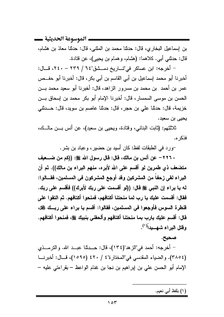 ٢٢٦٠ - عن أنس بن مالك، قال: قال رسول الله - صلى الله عليه وسلم -: "كم من ضعيف متضعف ذي طمرين لو أقسم على الله لأبره، منهم البراء بن مالك". ثم أن البراء لقى زحفًا من المشركين وقد أوجع المشركون في المسلمين، فقالوا: له يا براء إن النبي - صلى الله عليه وسلم - قال: "لو أقسمت على ربك لأبرك" فأقسم على ربك. فقال: أقسمت عليك يا رب لما منحتنا أكتافهم، فمنحوا أكتافهم. ثم التقوا على قنطرة السوس فأوجعوا في المسلمين، فقالوا: أقسم يا براء على ربك عز وجل، قال: أقسم عليك يا رب بما منحتنا أكتافهم وألحقني بنبيك - صلى الله عليه وسلم -، فمنحوا أكتافهم. وقتل البراء شهيدًا (¬١).