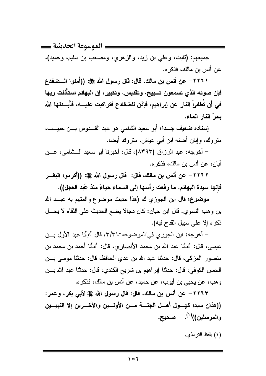 ٢٢٦١ - عن أنس بن مالك، قال: قال رسول الله - صلى الله عليه وسلم -: "أَمنوا الضفدع فإن صوته الذي تسمعون تسبيح، وتقديس، وتكبير، إن البهائم استأْذنت ربها في أن تُطفئَ النار عن إبراهيم، فإذن للضفادع فتراكبت عليه، فأَبدلها الله بحرّ النار الماءَ.