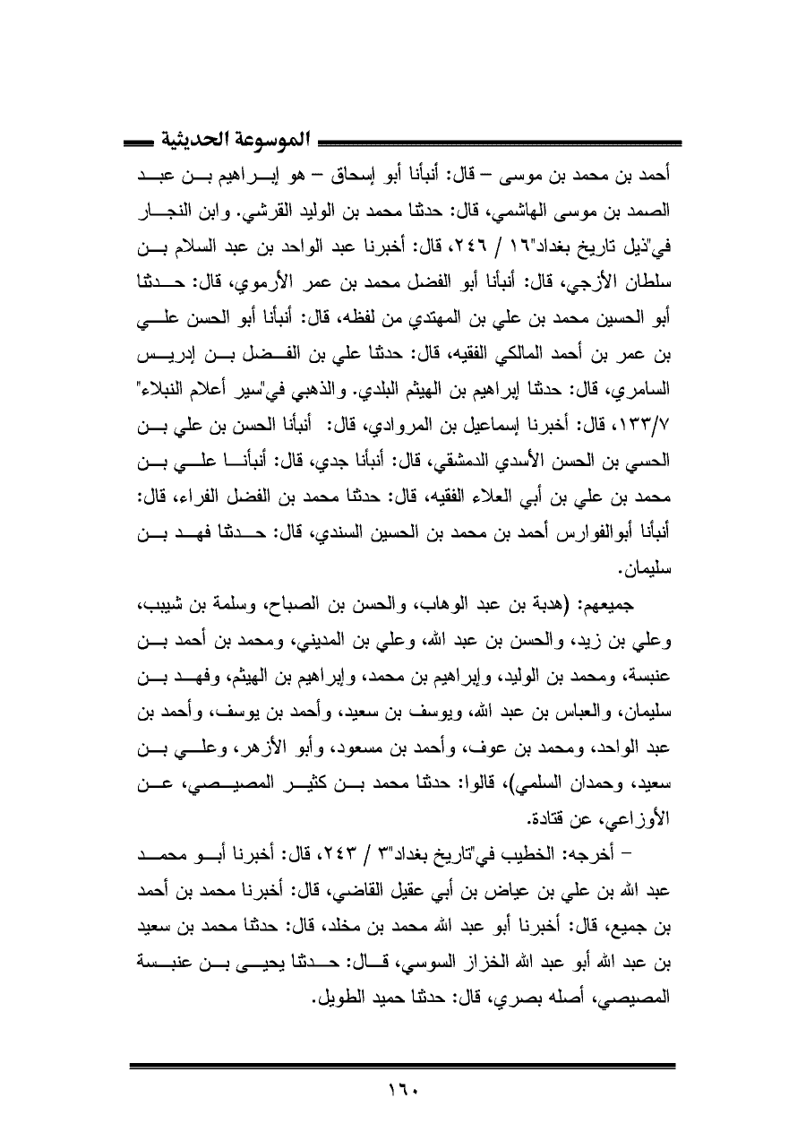 أحمد بن محمد بن موسى - قال: أنبأنا أبو إسحاق - هو إبراهيم بن عبد الصمد بن موسى الهاشمي، قال: حدثنا محمد بن الوليد القرشي. وابن النجار في "ذيل تاريخ بغداد"١٦/ ٢٤٦، قال: أخبرنا عبد الواحد بن عبد السلام بن سلطان الأزجي، قال: أنبأنا أبو الفضل محمد بن عمر الأرموي، قال: حدثنا أبو الحسين محمد بن علي بن المهتدي من لفظه، قال: أنبأنا أبو الحسن علي بن عمر بن أحمد المالكي الفقيه، قال: حدثنا علي بن الفضل بن إدريس السامري، قال: حدثنا إبراهيم بن الهيثم البلدي. والذهبي في "سير أعلام النبلاء" ٧/ ١٣٣، قال: أخبرنا إسماعيل بن المروادي، قال: أنبأنا الحسن بن علي بن الحسي بن الحسن الأسدي الدمشقي، قال: أنبأنا جدي، قال: أنبأنا علي بن محمد بن علي بن أبي العلاء الفقيه، قال: حدثنا محمد بن الفضل الفراء، قال: أنبأنا أبو الفوارس أحمد بن محمد بن الحسين السندي، قال: حدثنا فهد بن سليمان.