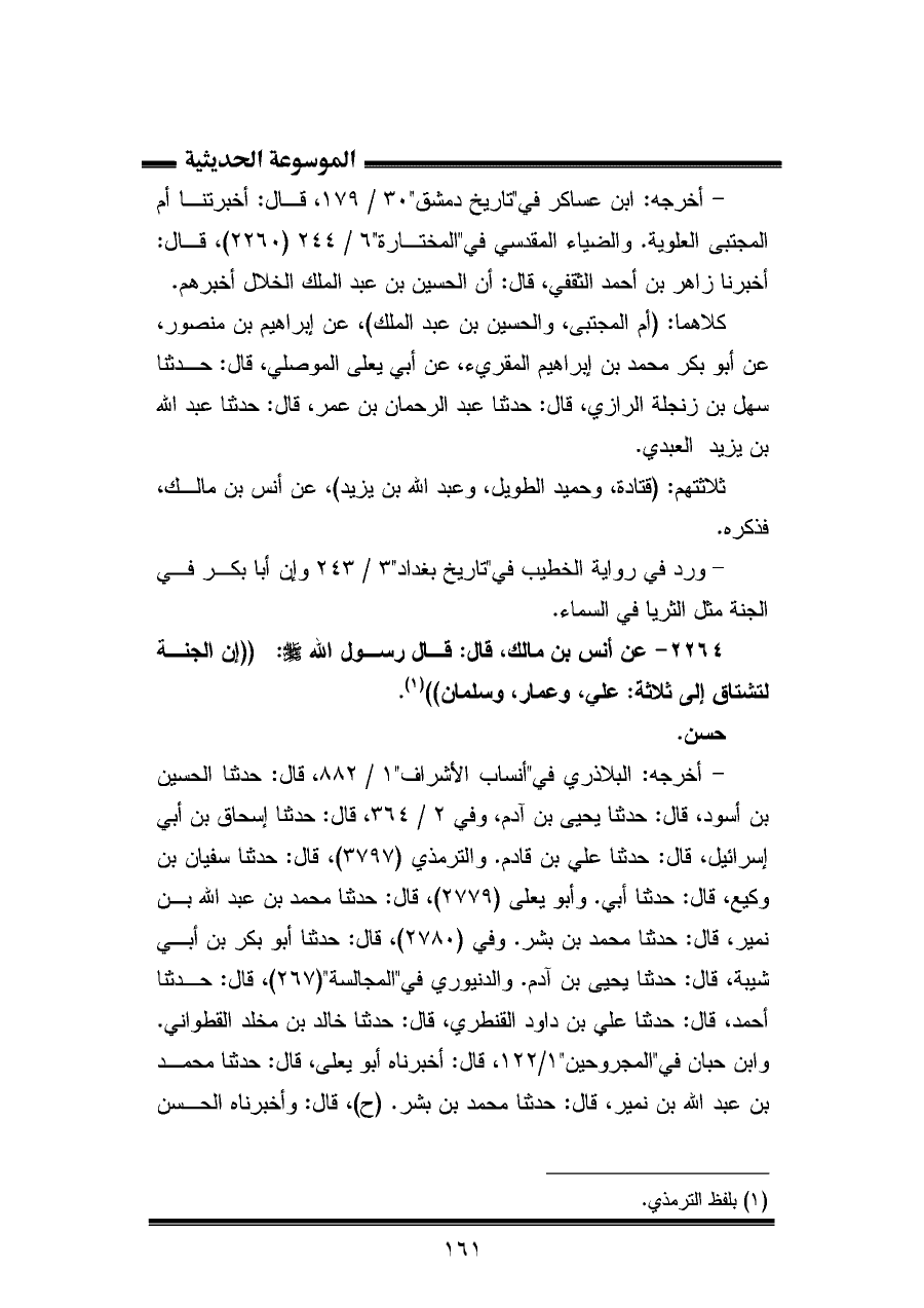 ٢٢٦٤ - عن أنس بن مالك، قال: قال رسول الله - صلى الله عليه وسلم -: "إن الجنة لتشتاق إلى ثلاثة: علي، وعمار، وسلمان" (¬١).