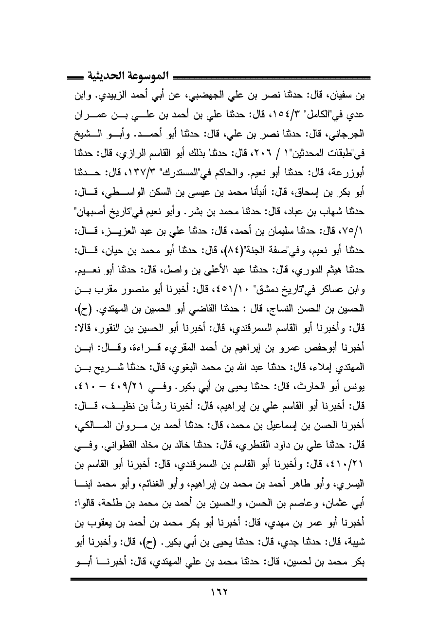 بن سفيان، قال: حدثنا نصر بن علي الجهضبي، عن أبي أحمد الزبيدي. وابن عدي في "الكامل" ٣/ ١٥٤، قال: حدثنا علي بن أحمد بن علي بن عمران الجرجاني، قال: حدثنا نصر بن علي، قال: حدثنا أبو أحمد. وأبو الشيخ في "طبقات المحدثين" ١/ ٢٠٦، قال: حدثنا بذلك أبو القاسم الرازي، قال: حدثنا أبو زرعة، قال: حدثنا أبو نعيم. والحاكم في "المستدرك" ٣/ ١٣٧، قال: حدثنا أبو بكر بن إسحاق، قال: أنبأنا محمد بن عيسى بن السكن الواسطي، قال: حدثنا شهاب بن عباد، قال: حدثنا محمد بن بشر. وأبو نعيم في "تاريخ أصبهان" ١/ ٧٥، قال: حدثنا سليمان بن أحمد، قال: حدثنا علي بن عبد العزيز، قال: حدثنا أبو نعيم، وفي "صفة الجنة" (٨٤)، قال: حدثنا أبو محمد بن حيان، قال: حدثنا هيثم الدوري، قال: حدثنا عبد الأعلى بن واصل، قال: حدثنا أبو نعيم. وابن عساكر في "تاريخ دمشق" ١٠/ ٤٥١، قال: أخبرنا أبو منصور مقرب بن الحسين بن الحسن النساج، قال: حدثنا القاضي أبو الحسين بن المهتدي. (ح)، قال: وأخبرنا أبو القاسم السمرقندي، قال: أخبرنا أبو الحسين بن النقور، قالا: أخبرنا أبو حفص عمرو بن إبراهيم بن أحمد المقريء قراءة، وقال: ابن المهتدي إملاء، قال: حدثنا عبد الله بن محمد البغوي، قال: حدثنا شريح بن يونس أبو الحارث، قال: حدثنا يحيى بن أبي بكير. وفي ٢١/ ٤٠٩ - ٤١٠، قال: أخبرنا أبو القاسم علي بن إبراهيم، قال: أخبرنا رشأ بن نظيف، قال: أخبرنا الحسن بن إسماعيل بن محمد، قال: حدثنا أحمد بن مروان المالكي، قال: حدثنا علي بن داود القنطري، قال: حدثنا خالد بن مخلد القطواني. وفي ٢١/ ٤١٠، قال: وأخبرنا أبو القاسم بن السمرقندي، قال: أخبرنا أبو القاسم بن اليسري، وأبو طاهر أحمد بن محمد بن إبراهيم، وأبو الغنائم، وأبو محمد ابنا أبي عثمان، وعاصم بن الحسن، والحسين بن أحمد بن محمد بن طلحة، قالوا: أخبرنا أبو عمر بن مهدي، قال: أخبرنا أبو بكر محمد بن أحمد بن يعقوب بن شيبة، قال: حدثنا جدي، قال: حدثنا يحيى بن أبي بكير. (ح)، قال: وأخبرنا أبو بكر محمد بن لحسين، قال: حدثنا محمد بن علي المهتدي، قال: أخبرنا أبو