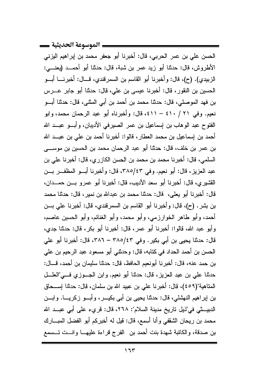 الحسن علي بن عمر الحربي، قال: أخبرنا أبو جعفر محمد بن إبراهيم اليزني الأطروش، قال: حدثنا أبو زيد عمر بن شبة، قال: حدثنا أبو أحمد (يعني: الزبيدي). (ح)، قال: وأخبرنا أبو القاسم بن السمرقندي، قال: أخبرنا أبو الحسين بن النقور، قال: أخبرنا عيسى بن علي، قال: حدثنا أبو جابر عرس بن فهد الموصلي، قال: حدثنا محمد بن أحمد بن أبي المثنى، قال: حدثنا أبو نعيم. وفي ٢١/ ٤١٠ - ٤١١، قال: وأخبرناه أبو عبد الرحمان محمد، وأبو الفتوح عبد الوهاب بن إسماعيل بن عمر الصيرفي الأديبان، وأبو عبد الله أحمد بن إسماعيل بن محمد العطار، قالوا: أخبرنا أحمد بن علي بن عبد الله بن عمر بن خلف، قال: حدثنا أبو عبد الرحمان محمد بن الحسين بن موسى السلمي، قال: أخبرنا محمد بن محمد بن الحسن الكازري، قال: أخبرنا علي بن عبد العزيز، قال: أبو نعيم. وفي ٤٣/ ٣٨٥، قال: وأخبرنا أبو المظفر بن القشيري، قال: أخبرنا أبو سعد الأديب، قال: أخبرنا أبو عمرو بن حمدان، قال: أخبرنا أبو يعلى، قال: حدثنا محمد بن عبد الله بن نمير، قال: حدثنا محمد بن بشر. (ح)، قال: وأخبرنا أبو القاسم بن السمرقندي، قال: أخبرنا علي بن أحمد، وأبو طاهر الخوارزمي، وأبو محمد، وأبو الغنائم، وأبو الحسين عاصم، وأبو عبد الله، قالوا: أخبرنا أبو عمر، قال: أخبرنا أبو بكر، قال: حدثنا جدي، قال: حدثنا يحيى بن أبي بكير. وفي ٤٣/ ٣٨٥ - ٣٨٦، قال: أخبرنا أبو علي الحسن بن أحمد الحداد في كتابه، قال: وحدثني أبو مسعود عبد الرحيم بن علي بن حمد عنه، قال: أخبرنا أبو نعيم الحافظ، قال: حدثنا سليمان بن أحمد، قال: حدثنا علي بن عبد العزيز، قال: حدثنا أبو نعيم. وابن الجوزي في "العلل المتناهية" (٤٥٩)، قال: أخبرنا علي بن عبيد الله بن سلمان، قال: حدثنا إسحاق بن إبراهيم النهشلي، قال: حدثنا يحيى بن أبى بكير، وأبو زكريا. وابن الدبيثي في "ذيل تاريخ مدينة السلام": ٢٦٨، قال: قريء على أبي عبد الله محمد بن ريحان الشقفي وأنا أسمع، قال: قيل له أخبركم أبو الفضل المبارك بن صدقة، والكاتبة شهدة بنت أحمد بن الفرج قراءة عليها وأنت تسمع