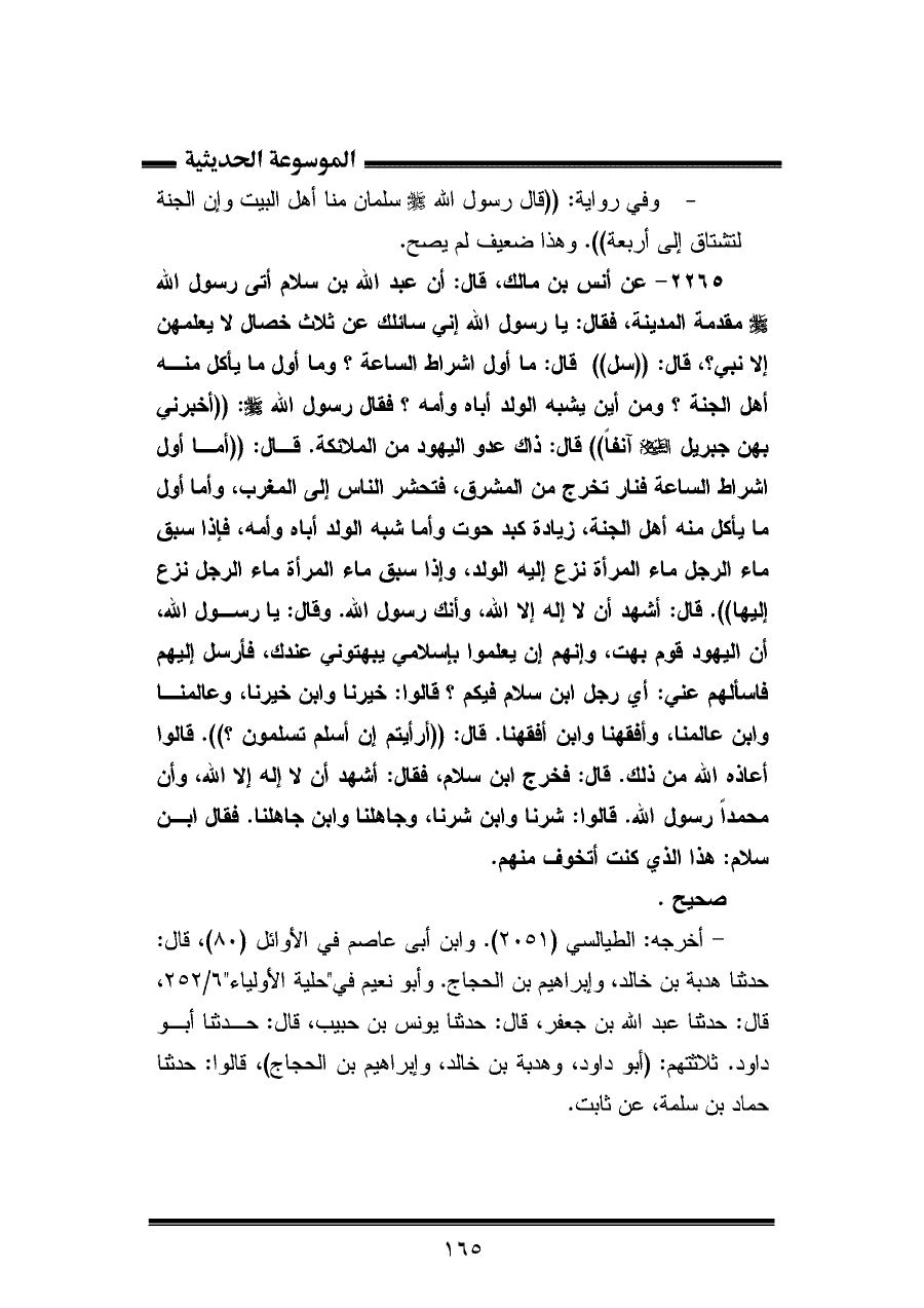 ٢٢٦٥ - عن أنس بن مالك، قال: أن عبد الله بن سلام أتى رسول الله - صلى الله عليه وسلم - مقدمة المدينة، فقال: يا رسول الله إني سائلك عن ثلاث خصال لا يعلمهن إلا نبي؟، قال: "سل" قال: ما أول اشراط الساعة؟ وما أول ما يأكل منه أهل الجنة؟ ومن أين يشبه الولد أباه وأمه؟ فقال رسول الله - صلى الله عليه وسلم -: "أخبرني بهن جبريل عليه السلام آنفًا" قال: ذلك عدو اليهود من الملائكة. قال: "أما أول أشراط الساعة فنار تخرج من المشرق، فتحشر الناس إلى المغرب، وأما أول ما يأكل منه أهل الجنة، زيادة كبد حوت وأما شبه الولد أباه وأمه، فإذا سبق ماء الرجل ماء المرأة نزع إليه الولد، وإذا سبق ماء المرأة ماء الرجل نزع إليها". قال: أشهد أن لا إله إلا الله، وأنك رسول الله. وقال: يا رسول الله، أن اليهود قوم بهت، وإنهم إن يعلموا بإسلامي يبهتوني عندك، فأرسل إليهم فاسألهم عني: أي رجل ابن سلام فيكم؟ قالوا: خيرنا وابن خيرنا، وعالمنا وابن عالمنا، وأفقهنا وابن أفقهنا قال: "أرأيتم إن أسلم تسلمون؟ ". قالوا أعاذه الله من ذلك. قال: فخرج ابن سلام، فقال: أشهد أن لا إله إلا الله، وأن محمدًا رسول الله. قالوا: شرنا وابن شرنا، وجاهلنا وابن جاهلنا. فقال ابن سلام: هذا الذي كنت أتخوف منهم.
