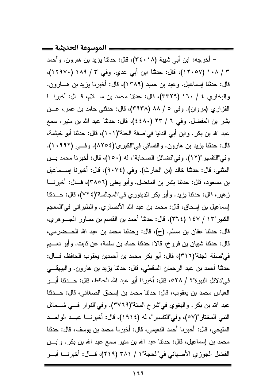 - أخرجه: ابن أبي شيبة (٣٤٠١٨)، قال: حدثنا يزيد بن هارون. وأحمد ٣/ ١٠٨ (١٢٠٥٧)، قال: حدثنا ابن أبي عدي. وفي ٣/ ١٨٩ (١٢٩٧٠)، قال: حدثنا إسماعيل. وعبد بن حميد (١٣٨٩)، قال: أخبرنا يزيد بن هارون. والبخاري ٤/ ١٦٠ (٣٣٢٩)، قال: حدثنا محمد بن سلام، قال: أخبرنا الفزاري (مروان). وفي ٥/ ٨٨ (٣٩٣٨)، قال: حدثني حامد بن عمر، عن بشر بن المفضل. وفي ٦/ ٢٣ (٤٤٨٠)، قال: حدثنا عبد الله بن منير، سمع عبد الله بن بكر. وابن أبي الدنيا في "صفة الجنة" (١٠١)، قال: حدثنا أبو خيثمة، قال: حدثنا يزيد بن هارون. والنسائي في "الكبرى" (٨٢٥٤). وفي (١٠٩٩٢). وفي "التفسير" (١٢). وفي افضائل الصحابة، له (١٥٠)، قال: أخبرنا محمد بن المثنى، قال: حدثنا خالد (بن الحارث). وفي (٩٠٧٤)، قال: أخبرنا إسماعيل بن مسعود، قال: حدثنا بشر بن المفضل. وأبو يعلى (٣٨٥٦)، قال: أخبرنا زهير، قال: حدثنا يزيد. وأبو بكر الدينوري في "المجالسة" (٧٢٤)، قال: حدثنا إسماعيل بن إسحاق، قال: محمد بن عبد الله الأنصاري. والطبر اني في "المعجم الكبير" ١٣/ ١٤٧ (٣٦٤)، قال: حدثنا أحمد بن القاسم بن مساور الجوهري، قال: حدثنا عفان بن مسلم. (ح)، قال: وحدثنا محمد بن عبد الله الحضرمي، قال: حدثنا شيبان بن فروخ، قالا: حدثنا حماد بن سلمة، عن ثابت. وأبو نعيم في "صفة الجنة" (٣١٦)، قال: أبو بكر محمد بن أحمد بن يعقوب الحافظ، قال: حدثنا أحمد بن عبد الرحمان السقطي، قال: حدثنا يزيد بن هارون. والبيهقي في "دلائل النبوة"٢/ ٥٢٨، قال: أخبرنا أبو عبد الله الحافظ، قال: حدثنا أبو العباس محمد بن يعقوب، قال: حدثنا محمد بن إسحاق الصغاني، قال: حدثنا عبد الله بن بكر. والبغوي في "شرح السنة" (٣٧٦٩). وفي "الأنوار في شمائل النبي المختار" (٥٧)، وفي "التفسير"، له (١٩١٤)، قال: أخبرنا عبد الواحد المليحي، قال: أخبرنا أحمد النعيمي، قال: أخبرنا محمد بن يوسف، قال: حدثنا محمد بن إسماعيل، قال: حدثنا عبد الله بن منير سمع عبد الله بن بكر. وابن الفضل الجوزي الأصبهاني في "الحجة" ١/ ٣٨١ (٢١٩)، قال: أخبرنا أبو