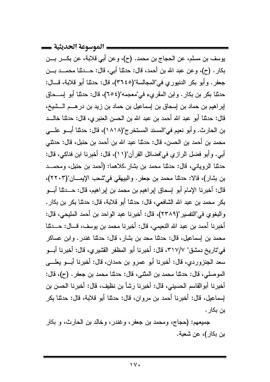 يوسف بن مسلم، عن الحجاج بن محمد. (ح)، وعن أبي قلابة، عن بكر بن بكر. (ح)، وعن عبد الله بن أحمد، قال: حدثنا أبي، قال: حدثنا محمد بن جعفر. وأبو بكر الدنيوري في "المجالسة" (٣٦٤٥)، قال: حدثنا أبو قلابة، قال: حدثنا بكر بن بكار. وابن المقريء في "معجمه" (٦٥٤)، قال: حدثنا أبو إسحاق إبراهيم بن حماد بن إسحاق بن إسماعيل بن حماد بن زيد بن درهم الشيخ، قال: حدثنا أبو عبد الله أحمد بن عبد الله بن الحسن العنبري، قال: حدثنا خالد بن الحارث. وأبو نعيم في "المسند المستخرج" (١٨١٨)، قال: حدثنا أبو علي محمد بن أحمد بن الحسن، قال: حدثنا عبد الله بن أحمد بن حنبل، قال: حدثني أبي. وأبو فضل الرازي في "فضائل القرآن" (١١)، قال: أخبرنا ابن فناكي، قال: حدثنا الروياني، قال: حدثنا محمد بن بشار. كلاهما: (أحمد بن حنبل، ومحمد بن بشار)، قالا: حدثنا محمد بن جعفر. والبيهقي في "شعب الإيمان" (٢٢٠٣)، قال: أخبرنا الإمام أبو إسحاق إبراهيم بن محمد بن إبراهيم، قال: حدثنا أبو بكر محمد بن عبد الله الشافعي، قال: حدثنا أبو قلابة، قال: حدثنا بكر بن بكار. والبغوي في "التفسير" (٢٣٨٩)، قال: أخبرنا عبد الواحد بن أحمد المليحي، قال: أخبرنا أحمد بن عبد الله النعيمي، قال: أخبرنا محمد بن يوسف، قال: حدثنا محمد بن إسماعيل، قال: حدثنا محمد بن بشار، قال: حدثنا غندر. وابن عساكر في "تاريخ دمشق" ٧/ ٣١٧، قال: أخبرنا أبو المظفر القشيري، قال: أخبرنا أبو سعد الجنزوردي، قال: أخبرنا أبو عمرو بن حمدان، قال: أخبرنا أبو يعلى الموصلي، قال: حدثنا محمد بن المثنى، قال: حدثنا محمد بن جعفر. (ح)، قال: أخبرنا أبو القاسم الحسيني، قال: أخبرنا رشأ بن نظيف، قال: أخبرنا الحسن بن إسماعيل، قال: أخبرنا أحمد بن مروان، قال: حدثنا أبو قلابة، قال: حدثنا بكر بن بكار.
