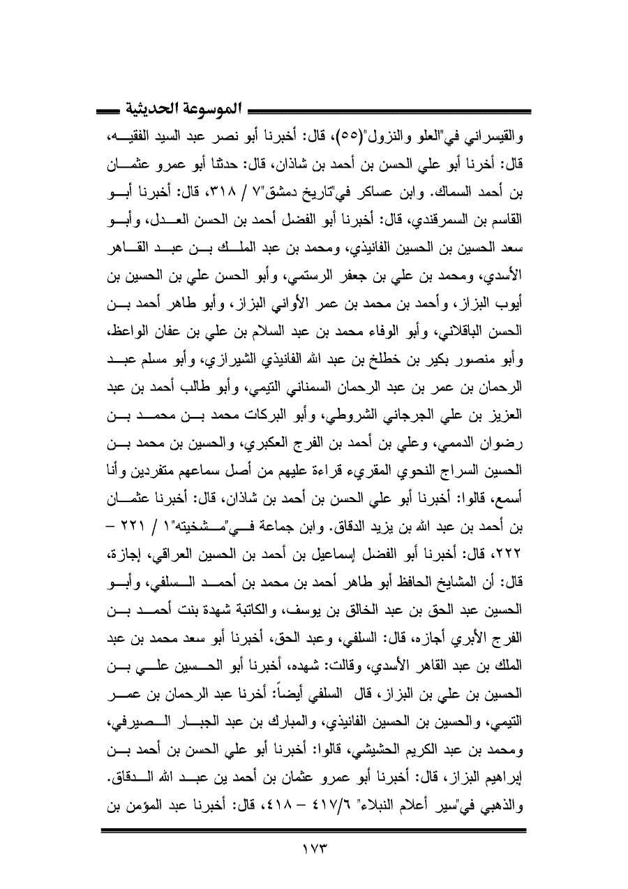 والقيسراني في "العلو والنزول" (٥٥)، قال: أخبرنا أبو نصر عبد السيد الفقيه، قال: أخبرنا أبو علي الحسن بن أحمد بن شاذان، قال: حدثنا أبو عمرو عثمان بن أحمد السماك. وابن عساكر في "تاريخ دمشق" ٧/ ٣١٨، قال: أخبرنا أبو القاسم بن السمرقندي، قال: أخبرنا أبو الفضل أحمد بن الحسن العدل، وأبو سعد الحسين بن الحسين الفانيذي، ومحمد بن عبد الملك بن عبد القاهر الأسدي، ومحمد بن علي بن جعفر الرستمي، وأبو الحسن علي بن الحسين بن أيوب البزاز، وأحمد بن محمد بن عمر الأواني البزاز، وأبو طاهر أحمد بن الحسن الباقلاني، وأبو الوفاء محمد بن عبد السلام بن علي بن عفان الواعظ، وأبو منصور بكير بن خطلخ بن عبد الله الفانيذي الشيرازي، وأبو مسلم عبد الرحمان بن عمر بن عبد الرحمان السمناني التيمي، وأبو طالب أحمد بن عبد العزيز بن علي الجرجاني الشروطي، وأبو البركات محمد بن محمد بن رضوان الدممي، وعلي بن أحمد بن الفرج العبري، والحسين بن محمد بن الحسين السراج النحوي المقريء قراءة عليهم من أصل سماعهم متفردين وأنا أسمع، قالوا: أخبرنا أبو علي الحسن بن أحمد بن شاذان، قال: أخبرنا عثمان بن أحمد بن عبد الله بن يزيد الدقاق. وابن جماعة في "مشخيته" ١/ ٢٢١ - ٢٢٢، قال: أخبرنا أبو الفضل إسماعيل بن أحمد بن الحسين العراقي، إجازة، قال: أن المشايخ الحافظ أبو طاهر أحمد بن محمد بن أحمد السلفي، وأبو الحسين عبد الحق بن عبد الخالق بن يوسف، والكاتبة شهدة بنت أحمد بن الفرج الأبري أجازه، قال: السلفي، وعبد الحق، أخبرنا أبو سعد محمد بن عبد الملك بن عبد القاهر الأسدي، وقالت: شهده، أخبرنا أبو الحسين علي بن الحسين بن علي بن البزاز، قال السلفي أيضًا: أخرنا عبد الرحمان بن عمر التيمي، والحسين بن الحسين الفانيذي، والمبارك بن عبد الجبار الصيرفي، ومحمد بن عبد الكريم الحشيشي، قالوا: أخبرنا أبو علي الحسن بن أحمد بن إبراهيم البزاز، قال: أخبرنا أبو عمرو عثمان بن أحمد ين عبد الله الدقاق. والذهبي في "سير أعلام النبلاء" ٦/ ٤١٧ - ٤١٨، قال: أخبرنا عبد المؤمن بن
