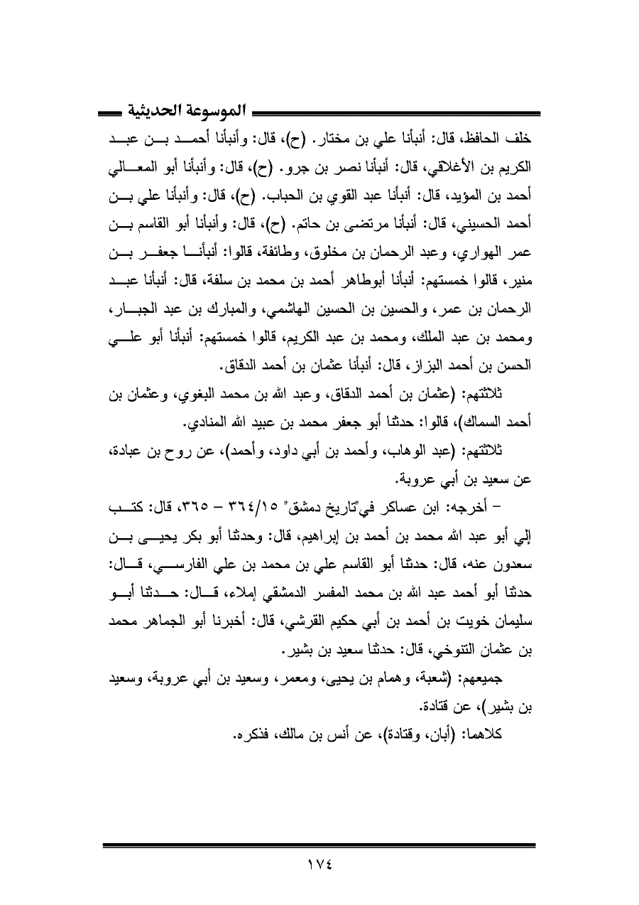خلف الحافظ، قال: أنبأنا علي بن مختار. (ح)، قال: وأنبأنا أحمد بن عبد الكريم بن الأغلاقي، قال: أنبأنا نصر بن جرو. (ح)، قال: وأنبأنا أبو المعالي أحمد بن المؤيد، قال: أنبأنا عبد القوي بن الحباب. (ح)، قال: وأنبأنا علي بن أحمد الحسيني، قال: أنبأنا مرتضى بن حاتم. (ح)، قال: وأنبأنا أبو القاسم بن عمر الهواري، وعبد الرحمان بن مخلوق، وطائفة، قالوا: أنبأنا جعفر بن منير، قالوا خمستهم: أنبأنا أبوطاهر أحمد بن محمد بن سلفة، قال: أنبأنا عبد الرحمان بن عمر، والحسين بن الحسين الهاشمي، والمبارك بن عبد الجبار، ومحمد بن عبد الملك، ومحمد بن عبد الكريم، قالوا خمستهم: أنبأنا أبو علي الحسن بن أحمد البزاز، قال: أنبأنا عثمان بن أحمد الدقاق.