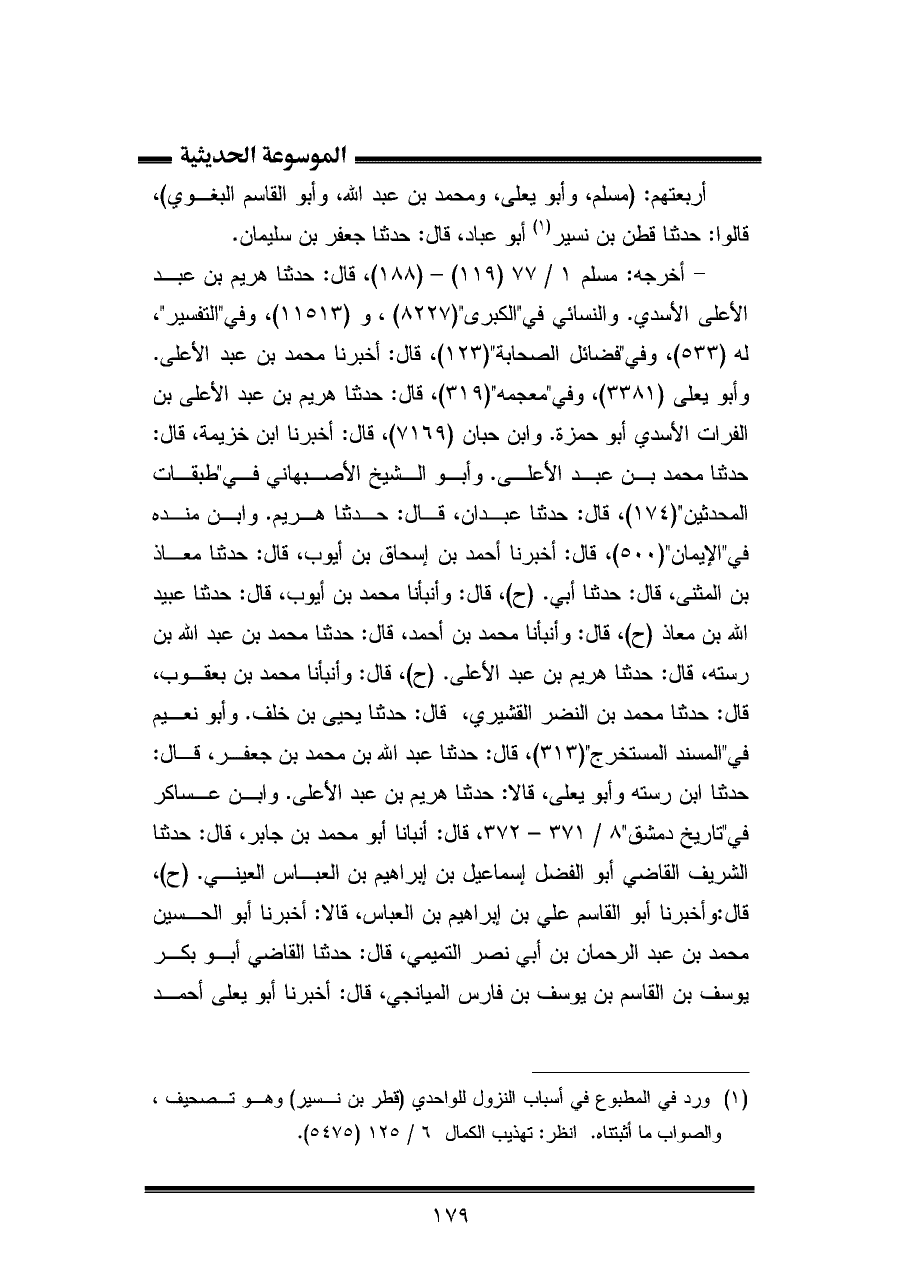 أربعتهم: (مسلم، وأبو يعلى، ومحمد بن عبد الله، وأبو القاسم البغوي)، قالوا: حدثنا قطن بن نسير (¬١) أبو عباد، قال: حدثنا جعفر بن سليمان.