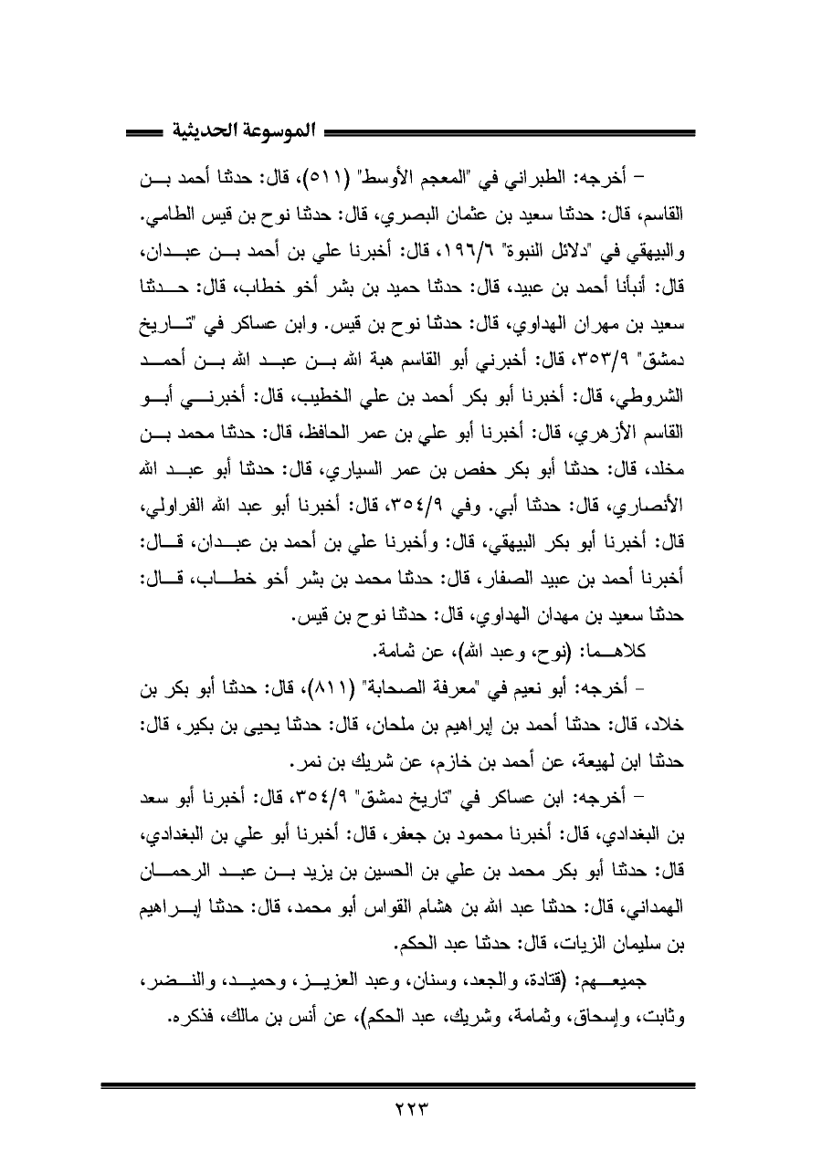 - أخرجه: الطبراني في "المعجم الأوسط" (٥١١)، قال: حدثنا أحمد بن القاسم، قال: حدثنا سعيد بن عثمان البصري، قال: حدثنا نوح بن قيس الطامي. والبيهقي في "دلائل النبوة" ٦/ ١٩٦، قال: أخبرنا علي بن أحمد بن عبدان، قال: أنبأنا أحمد بن عبيد، قال: حدثنا حميد بن بشر أخو خطاب، قال: حدثنا سعيد بن مهران الهداوي، قال: حدثنا نوح بن قيس. وابن عساكر في "تاريخ دمشق" ٩/ ٣٥٣، قال: أخبرني أبو القاسم هبة الله بن عبد الله بن أحمد الشروطي، قال: أخبرنا أبو بكر أحمد بن علي الخطيب، قال: أخبرني أبو القاسم الأزهري، قال: أخبرنا أبو علي بن عمر الحافظ، قال: حدثنا محمد بن مخلد، قال: حدثنا أبو بكر حفص بن عمر السياري، قال: حدثنا أبو عبد الله الأنصاري، قال: حدثنا أبي. وفي ٩/ ٣٥٤، قال: أخبرنا أبو عبد الله الفراولي، قال: أخبرنا أبو بكر البيهقي، قال: وأخبرنا علي بن أحمد بن عبدان، قال: أخبرنا أحمد بن عبيد الصفار، قال: حدثنا محمد بن بشر أخو خطاب، قال: حدثنا سعيد بن مهدان الهداوي، قال: حدثنا نوح بن قيس.