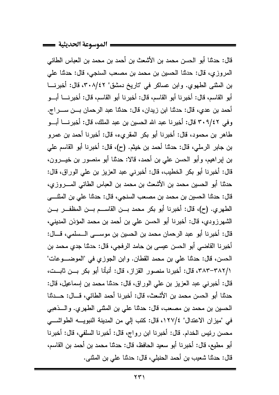 قال: حدثنا أبو الحسن محمد بن الأشعث بن أحمد بن محمد بن العباس الطائي المروزي، قال: حدثنا الحسين بن محمد بن مصعب السنجي، قال: حدثنا علي بن المثنى الطهوي. وابن عساكر في "تاريخ دمشق" ٤٢/ ٣٠٨، قال: أخبرنا أبو القاسم، قال: أخبرنا أبو القاسم، قال: أخبرنا أبو القاسم، قال: أخبرنا أبو أحمد بن عدي، قال: حدثنا ابن زيدان، قال: حدثنا عبد الرحمان بن سراج. وفي ٤٢/ ٣٠٩ قال: أخبرنا عبد الله الحسين بن عبد الملك، قال: أخبرنا أبو طاهر بن محمود، قال: أخبرنا أبو بكر المقريء، قال: أخبرنا أحمد بن عمرو بن جابر الرملي، قال: حدثنا أحمد بن خيثم. (ح)، قال: أخبرنا أبو القاسم علي بن إبراهيم، وأبو الحسن علي بن أحمد، قالا: حدثنا أبو منصور بن خيرون، قال: أخبرنا أبو بكر الخطيب، قال: أخبرني عبد العزيز بن علي الوراق، قال: حدثنا أبو الحسين محمد بن الأشعث بن محمد بن العباس الطائي المروزي، قال: حدثنا الحسين بن محمد بن مصعب السنجي، قال: حدثنا علي بن المثنى الطهري. (ح)، قال: أخبرنا أبو بكر محمد بن القاسم بن المظفر بن الشهرزودي، قال: أخبرنا أبو الحسن علي بن أحمد بن محمد المؤذن المديني، قال: أخبرنا أبو عبد الرحمان محمد بن الحسين بن موسى السلمي، قال: أخبرنا القاضي أبو الحسن عيسى بن حامد الرفجي، قال: حدثنا جدي محمد بن الحسن، قال: حدثنا علي بن محمد القطان. وابن الجوزي في "الموضوعات" ١/ ٣٨٢ - ٣٨٣, قال: أخبرنا منصور القزاز، قال: أنبأنا أبو بكر بن ثابت، قال: أخبرني عبد العزيز بن علي الوراق، قال: حدثنا محمد بن إسماعيل، قال: حدثنا أبو الحسن محمد بن الأشعث، قال: أخبرنا أحمد الطائي، قال: حدثنا الحسين بن محمد بن مصعب، قال: حدثنا علي بن المثنى الطهري. والذهبي في "ميزان الاعتدال" ٤/ ١٢٧، قال: كتب إلي من المدينة النبويه الطواشي محسن رئيس الخدام. قال: أخبرنا ابن رواج، قال: أخبرنا السلفي، قال: أخبرنا أبو مطيع، قال: أخبرنا أبو سعيد الحافظ، قال: حدثنا محمد بن أحمد بن القاسم، قال: حدثنا شعيب بن أحمد الحنبلي، قال: حدثنا علي بن المثنى.