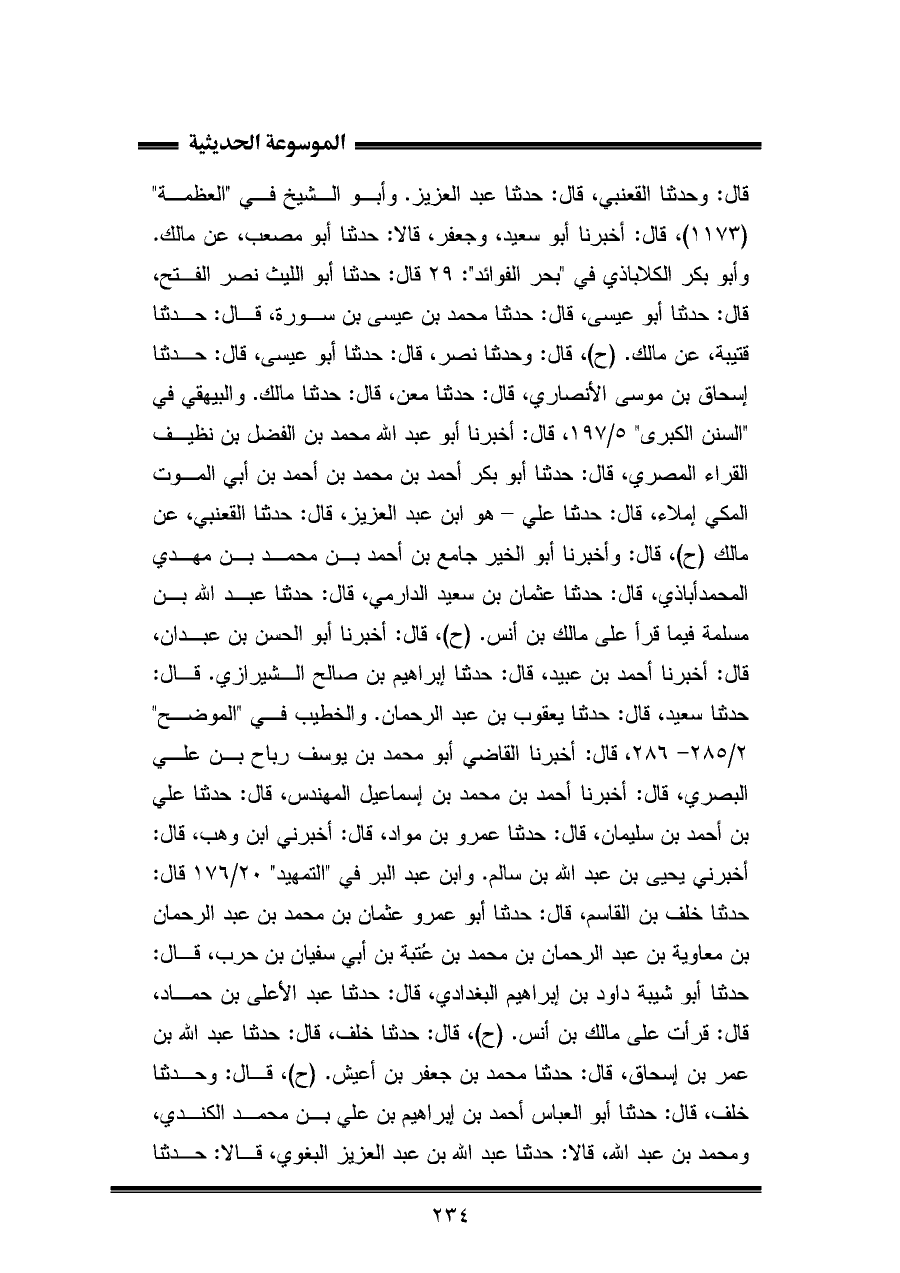 قال: وحدثنا القعنبي، قال: حدثنا عبد العزيز. وأبو الشيخ في "العظمة" (١١٧٣)، قال: أخبرنا أبو سعيد، وجعفر، قالا: حدثنا أبو مصعب، عن مالك. وأبو بكر الكلاباذي في "بحر الفوائد": ٢٩ قال: حدثنا أبو الليث نصر الفتح، قال: حدثنا أبو عيسى، قال: حدثنا محمد بن عيسى بن سورة، قال: حدثنا قتيبة، عن مالك. (ح)، قال: وحدثنا نصر، قال: حدثنا أبو عيسى، قال: حدثنا إسحاق بن موسى الأنصاري، قال: حدثنا معن، قال: حدثنا مالك. والبيهقي في "السنن الكبرى" ٥/ ١٩٧، قال: أخبرنا أبو عبد الله محمد بن الفضل بن نظيف القراء المصري، قال: حدثنا أبو بكر أحمد بن محمد بن أحمد بن أبي الموت المكي إملاء، قال: حدثنا علي - هو ابن عبد العزيز، قال: حدثنا القعنبي، عن مالك (ح)، قال: وأخبرنا أبو الخير جامع بن أحمد بن محمد بن مهدي المحمد أباذي، قال: حدثنا عثمان بن سعيد الدارمي، قال: حدثنا عبد الله بن مسلمة فيما قرأ على مالك بن أنس. (ح)، قال: أخبرنا أبو الحسن بن عبدان، قال: أخبرنا أحمد بن عبيد، قال: حدثنا إبراهيم بن صالح الشيرازي. قال: حدثنا سعيد، قال: حدثنا يعقوب بن عبد الرحمان. والخطيب في "الموضح" ٢/ ٢٨٥ - ٢٨٦، قال: أخبرنا القاضي أبو محمد بن يوسف رباح بن علي البصري، قال: أخبرنا أحمد بن محمد بن إسماعيل المهندس، قال: حدثنا علي بن أحمد بن سليمان، قال: حدثنا عمرو بن مواد، قال: أخبرني ابن وهب، قال: أخبرني يحيى بن عبد الله بن سالم. وابن عبد البر في "التمهيد" ٢٠/ ١٧٦ قال: حدثنا خلف بن القاسم، قال: حدثنا أبو عمرو عثمان بن محمد بن عبد الرحمان بن معاوية بن عبد الرحمان بن محمد بن عُتبة بن أبي سفيان بن حرب، قال: حدثنا أبو شيبة داود بن إبراهيم البغدادي، قال: حدثنا عبد الأعلى بن حماد، قال: قرأت على مالك بن أنس. (ح)، قال: حدثنا خلف، قال: حدثنا عبد الله بن عمر بن إسحاق، قال: حدثنا محمد بن جعفر بن أعيش. (ح)، قال: وحدثنا خلف، قال: حدثنا أبو العباس أحمد بن إبراهيم بن علي بن محمد الكندي، ومحمد بن عبد الله، قالا: حدثنا عبد الله بن عبد العزيز البغوي، قالا: حدثنا