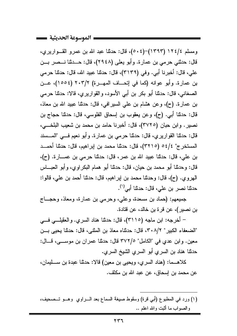 ومسلم ٤/ ١٢٤ (١٣٩٣) - (٥٠٤)، قال: حدثنا عبد الله بن عمرو القواريري، قال: حدثني حرمي بن عمارة. وأبو يعلى (٢٩٤٨)، قال: حدثنا نصر بن علي، قال: أخبرنا أبي. وفي (٣١٣٩)، قال: حدثنا عبيد الله، قال: حدثنا حرمي بن عمارة. وأبو عوانه (كما في إتحاف المهرة) ٢/ ٢٠٣ (١٥٥٤)، عن الصغاني، قال: حدثنا أبو بكر بن أبي الأسود، والقواريري، قالا: حدثنا حرمي بن عمارة. (ح)، وعن هشام بن علي السيرافي, قال: حدثنا عبيد الله بن معاذ، قال: حدثنا أبي. (ح)، وعن يعقوب بن إسحاق الفلوسي، قال: حدثنا حجاج بن نصير. وابن حبان (٣٧٢٥)، قال: أخبرنا حامد بن محمد بن شعيب البلخي، قال: حدثنا القواريري، قال: حدثنا حرمي بن عمارة. وأبو نعيم في "المسند المستخرج" ٤/ ٥٤ (٣٢١٥)، قال: حدثنا محمد بن إبراهيم، قال: حدثنا أحمد بن علي، قال: حدثنا عبيد الله بن عمر، قال: حدثنا حرمي بن عمارة. (ح)، قال: وحدثنا أبو محمد بن حيان، قال: حدثنا أبو همام البكراوي، وأبو العباس الهروي. (ح)، قال: وحدثنا محمد بن إبراهيم، قال: حدثنا أحمد بن علي، قالوا: حدثنا نصر بن علي، قال: حدثنا أبي (¬١).