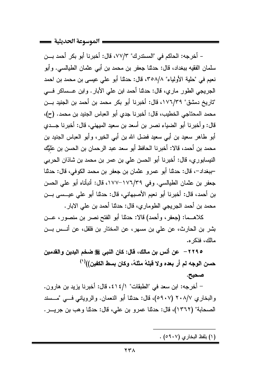 ٢٢٩٥ - عن أنس بن مالك، قال: كان النبي - صلى الله عليه وسلم - ضخم اليدين والقدمين حسن الوجه لم أر بعده ولا قبلهُ مثلهُ، وكان بسط الكفين" (¬١).