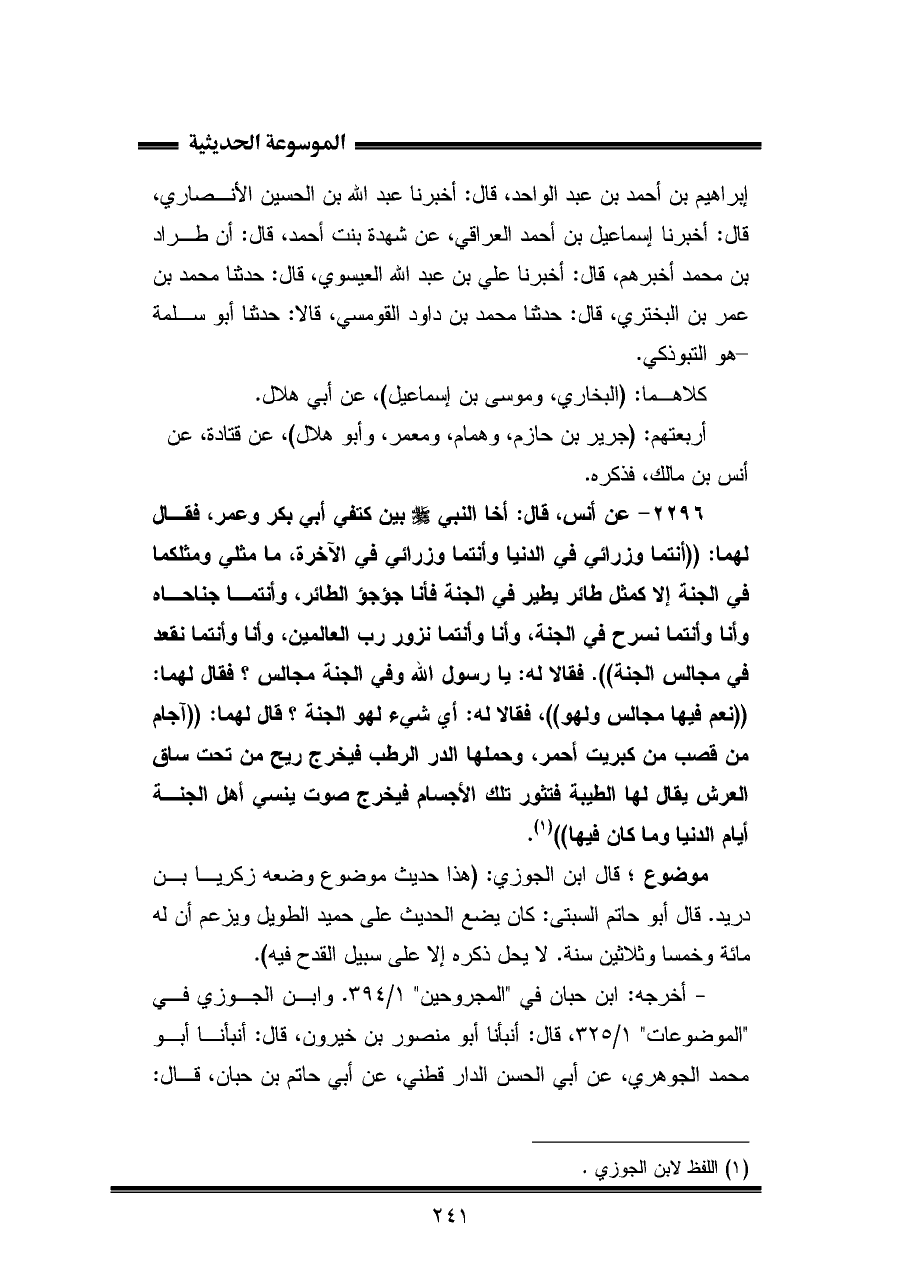 ٢٢٩٦ - عن أنس، قال: أخا النبي - صلى الله عليه وسلم - بين كتفي أبي بكر وعمر، فقال لهما: "أنتما وزرائي في الدنيا وأنتما وزرائي في الآخرة، ما مثلي ومثلكما في الجنة إلا كمثل طائر يطير في الجنة فأنا جؤجؤ الطائر، وأنتما جناحاه وأنا وأنتما نسرح في الجنة، وأنا وأنتما نزور رب العالمين، وأنا وأنتما نقعد في مجالس الجنة". فقالا له: يا رسول الله وفي الجنة مجالس؟ فقال لهما: "نعم فيها مجالس ولهو"، فقالا له: أي شيء لهو الجنة؟ قال لهما: "آجام من قصب من كبريت أحمر، وحملها الدر الرطب فيخرج ريح من تحت ساق العرش يقال لها الطيبة فتثور تلك الأجسام فيخرج صوت ينسي أهل الجنة أيام الدنيا وما كان فيها" (¬١).