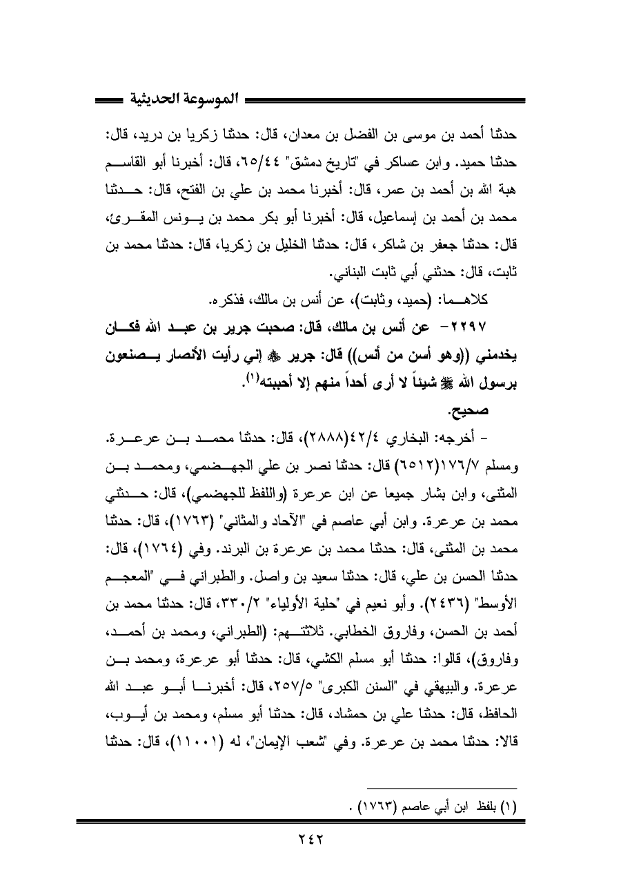 ٢٢٩٧ - عن أنس بن مالك، قال: صحبت جرير بن عبد الله فكان يخدمني "وهو أسن من أنس" قال: جرير إني رأيت الأنصار يصنعون برسول الله - صلى الله عليه وسلم - شيئًا لا أرى أحدًا منهم إلا أحببته (¬١).