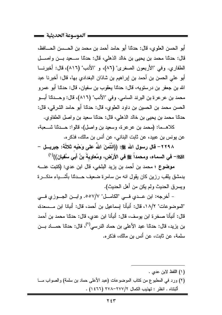 ٢٢٩٨ - قال رسول الله - صلى الله عليه وسلم -: "ائْتَمنَ اللهُ على وَحْيهِ ثلاثَة: جبريل - عَلَيْهِ السَّلَامِ - في السماء، ومحمدًا - صلى الله عليه وسلم - في الأرْضِ، ومُعاويِةَ بنُ أبي سُفيانَ" (¬١).