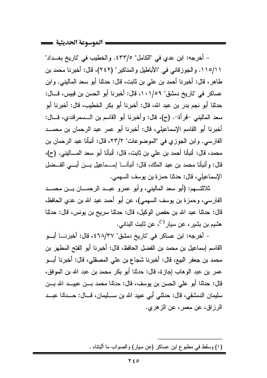 ثلاثتهم: (أبو سعد الماليني، وأبو عمرو عبد الرحمان بن محمد الفارسي، وحمزة بن يوسف السهمي)، عن أبو أحمد عبد الله بن عدي الحافظ، قال: حدثنا عبد الله بن حفص الوكيل، قال: حدثنا سريج بن يونس، قال: حدثنا هشيم بن بشير، عن سيار (¬١)، عن ثابت البناني.