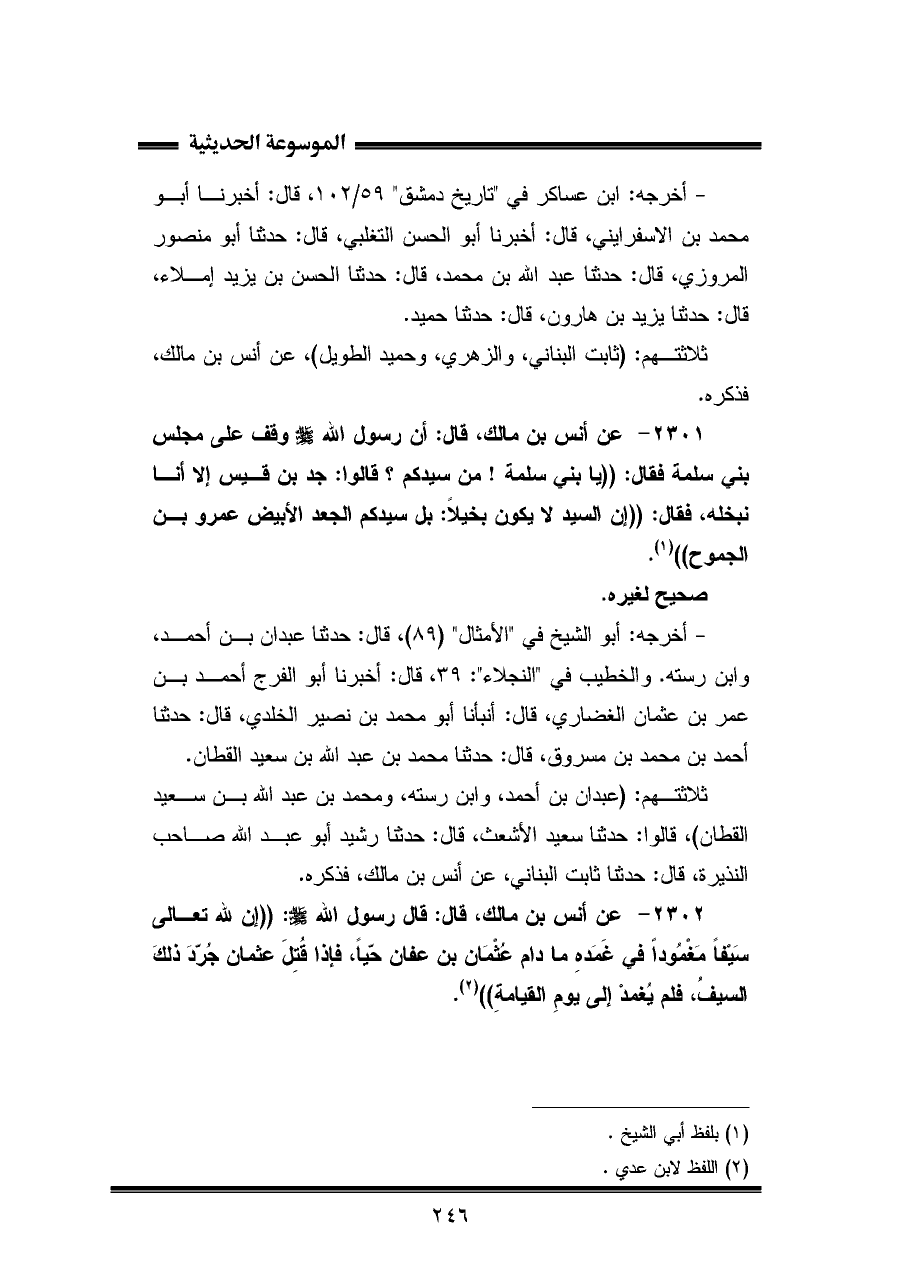 ٢٣٠٢ - عن أنس بن مالك، قال: قال رسول الله - صلى الله عليه وسلم -: "إن لله تعالى سَيْفًا مَغْمُودًا في غَمَدهِ ما دام عُثْمَان بن عفان حيًّا، فإذا قُتِلَ عثمان جُرِّدَ ذلكَ السيفُ، فلم يُغمدْ إلى يومِ القيامةِ" (¬٢).