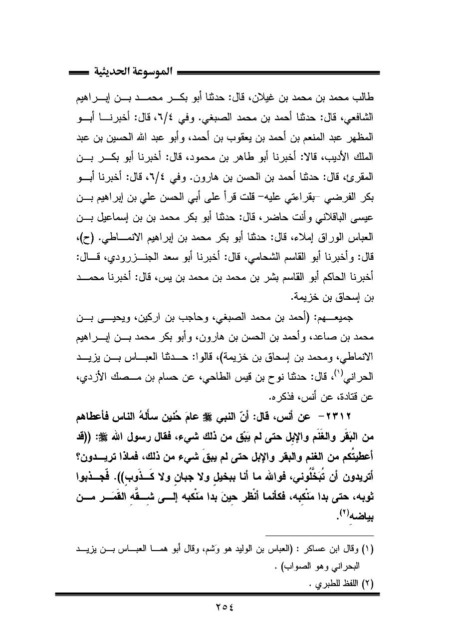طالب محمد بن محمد بن غيلان، قال: حدثنا أبو بكر محمد بن إبراهيم الشافعي، قال: حدثنا أحمد بن محمد الصبغي. وفي ٤/ ٦، قال: أخبرنا أبو المظهر عبد المنعم بن أحمد بن يعقوب بن أحمد، وأبو عبد الله الحسين بن عبد الملك الأديب، قالا: أخبرنا أبو طاهر بن محمود، قال: أخبرنا أبو بكر بن المقرئ، قال: حدثنا أحمد بن الحسن بن هارون. وفي ٤/ ٦، قال: أخبرنا أبو بكر الفرضي - بقراءتي عليه - قلت قرأ على أبي الحسن علي بن إبراهيم بن عيسى الباقلاني وأنت حاضر، قال: حدثنا أبو بكر محمد بن بن إسماعيل بن العباس الوراق إملاء، قال: حدثنا أبو بكر محمد بن إبراهيم الأنماطي. (ح)، قال: وأخبرنا أبو القاسم الشحامي، قال: أخبرنا أبو سعد الجنزرودي، قال: أخبرنا الحاكم أبو القاسم بشر بن محمد بن محمد بن يس، قال: أخبرنا محمد بن إسحاق بن خزيمة.