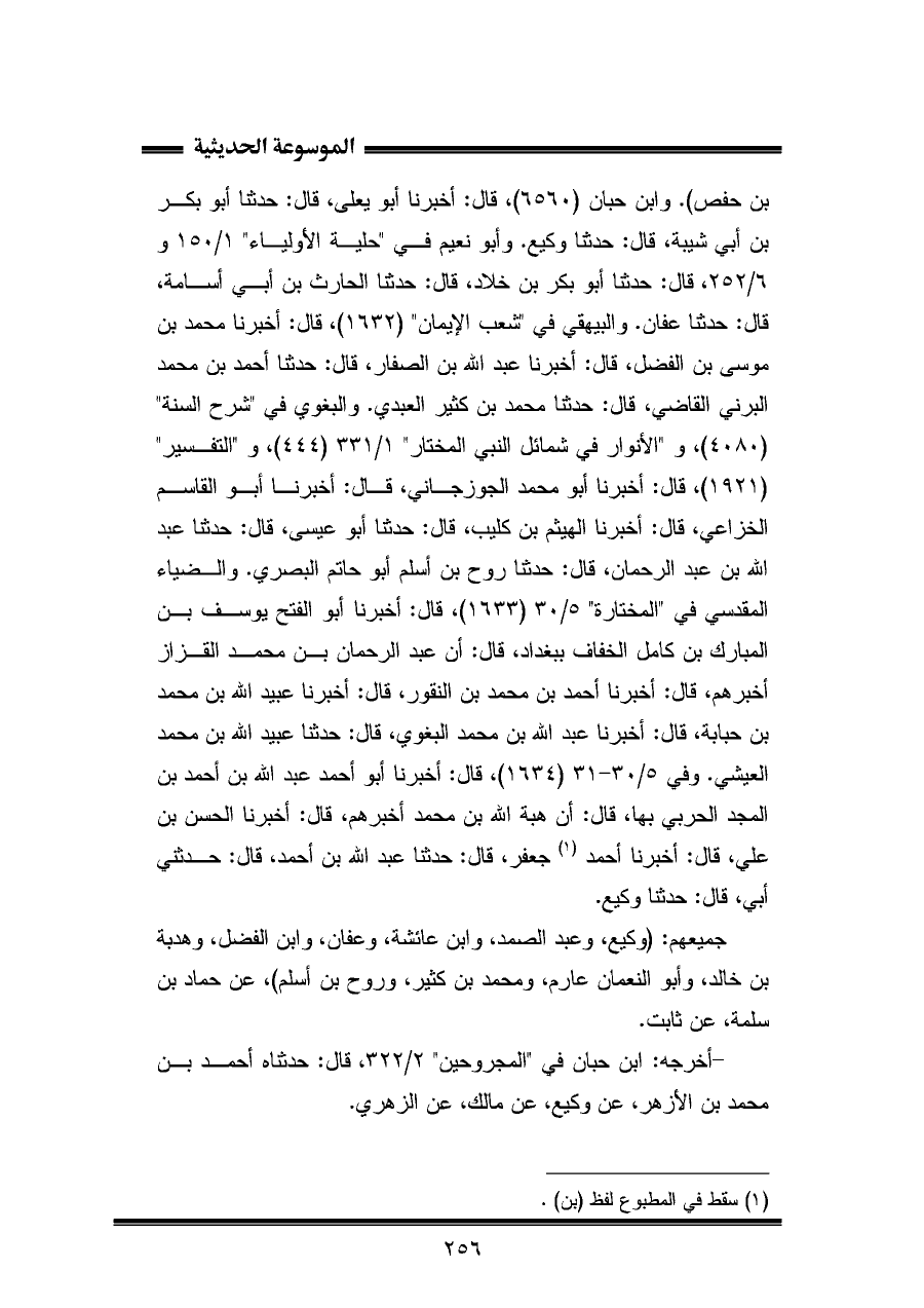 بن حفص). وابن حبان (٦٥٦٠)، قال: أخبرنا أبو يعلى، قال: حدثنا أبو بكر بن أبي شيبة، قال: حدثنا وكيع. وأبو نعيم في "حلية الأولياء" ١/ ١٥٠ و ٦/ ٢٥٢، قال: حدثنا أبو بكر بن خلاد، قال: حدثنا الحارث بن أبي أسامة، قال: حدثنا عفان. والبيهقي في "شعب الإيمان" (١٦٣٢)، قال: أخبرنا محمد بن موسى بن الفضل، قال: أخبرنا عبد الله بن الصفار، قال: حدثنا أحمد بن محمد البرني القاضي، قال: حدثنا محمد بن كثير العبدي. والبغوي في "شرح السنة" (٤٠٨٠)، و"الأنوار في شمائل النبي المختار" ١/ ٣٣١ (٤٤٤)، و"التفسير" (١٩٢١)، قال: أخبرنا أبو محمد الجوزجاني، قال: أخبرنا أبو القاسم الخزاعي، قال: أخبرنا الهيثم بن كليب، قال: حدثنا أبو عيسى، قال: حدثنا عبد الله بن عبد الرحمان، قال: حدثنا روح بن أسلم أبو حاتم البصري. والضياء المقدسي في "المختارة" ٥/ ٣٠ (١٦٣٣)، قال: أخبرنا أبو الفتح يوسف بن المبارك بن كامل الخفاف ببغداد، قال: أن عبد الرحمان بن محمد القزاز أخبرهم، قال: أخبرنا أحمد بن محمد بن النقور، قال: أخبرنا عبيد الله بن محمد بن حبابة، قال: أخبرنا عبد الله بن محمد البغوي، قال: حدثنا عبيد الله بن محمد العيشي. وفي ٥/ ٣٠ - ٣١ (١٦٣٤)، قال: أخبرنا أبو أحمد عبد الله بن أحمد بن المجد الحربي بها، قال: أن هبة الله بن محمد أخبرهم، قال: أخبرنا الحسن بن علي، قال: أخبرنا أحمد (¬١) جعفر، قال: حدثنا عبد الله بن أحمد، قال: حدثني أبي، قال: حدثنا وكيع.